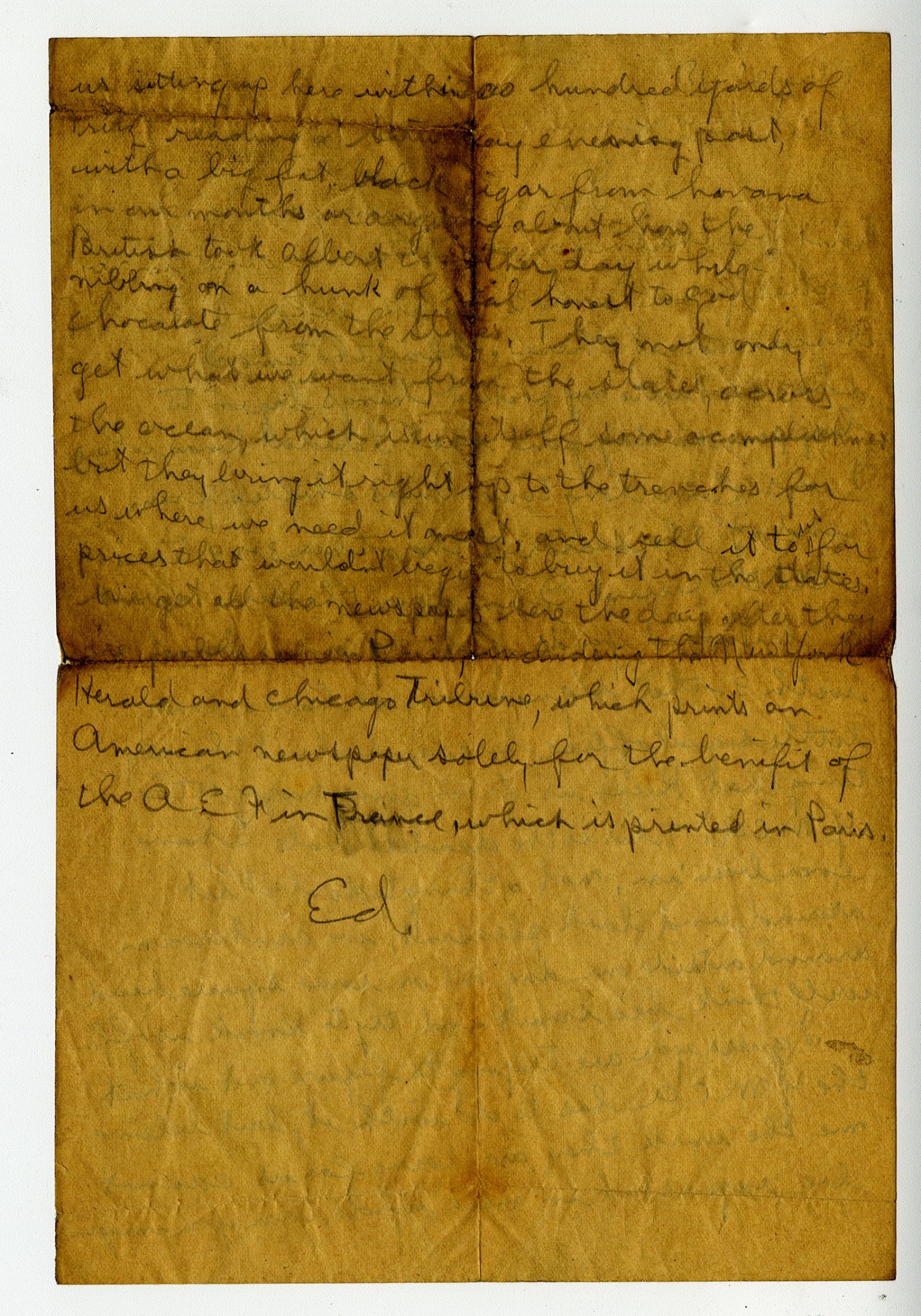 us sitting up here within a hundred yards of Fritz reading a Sunday evening Post, with a big fat black cigar from havana in our mouths or anything about how the British took Albot is [m.s. illegilbe 1 wd] day while nibbling on a hunk of [m.s. illegible: 1 wd] honest to God Chocolate from the States. They not only get what we want from the States across the ocean, which is [m.s. illegible: 1 wd] some accomplishment but they doing it right up to the trenches for us where we need it most, and sell it to us for prices that wouldn