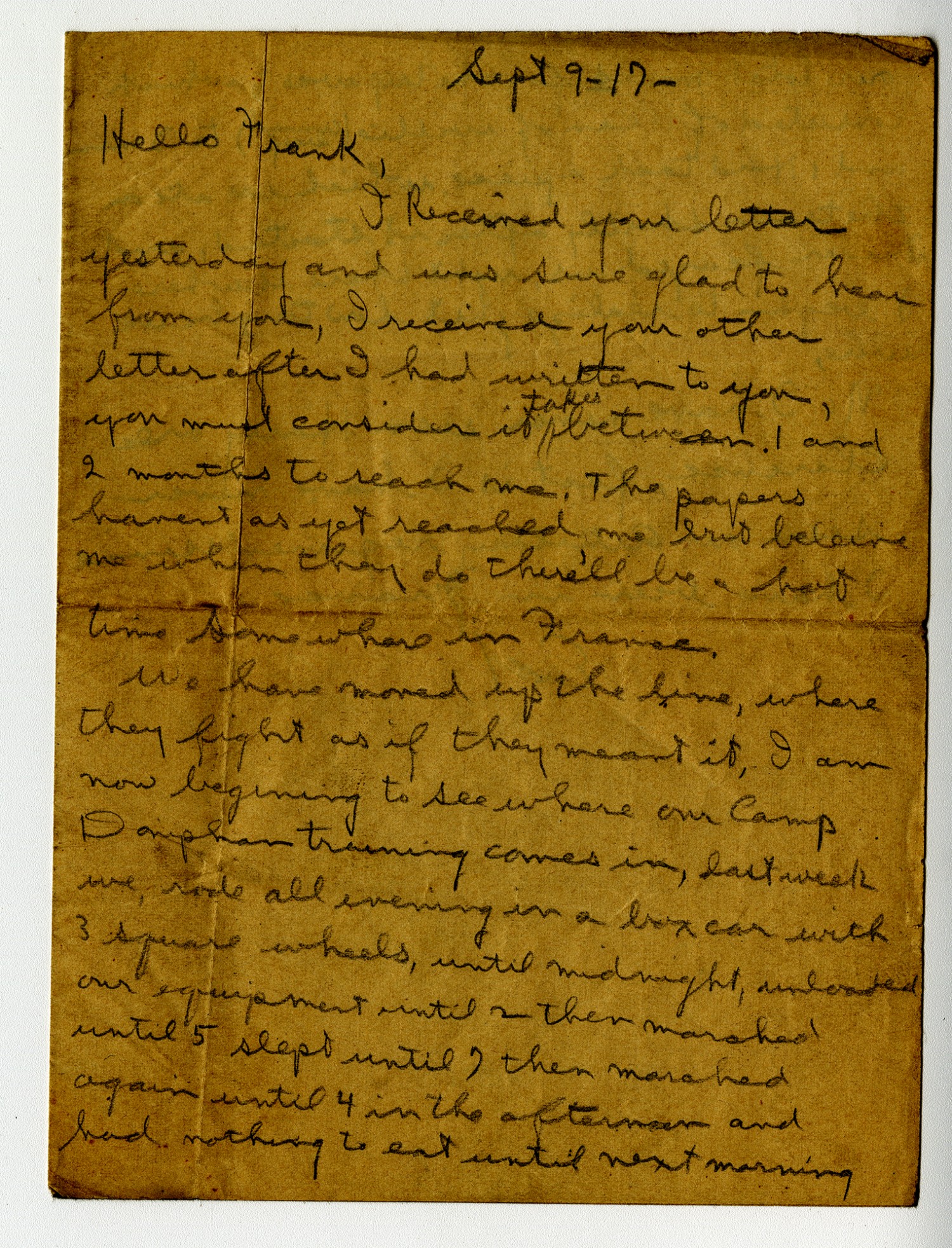 [September] 9-[1917] Hello Frank, I Received your letter yesterday and was sure glad to hear from you, I received your other letter after I had written to you, you must consider it takes between 1 and 2 months to reach me. The papers havent as yet reached me but believe me when they do there