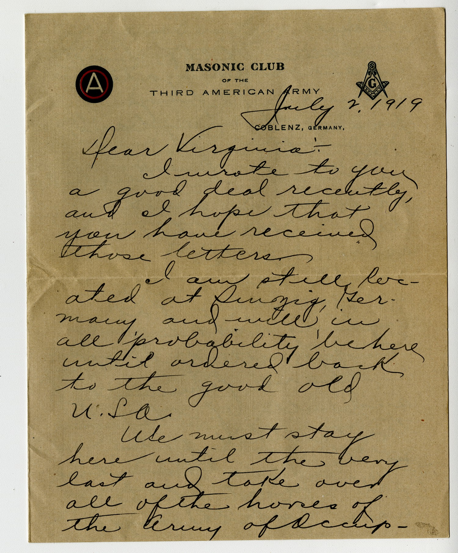 July 2, 1919 Dear Virginia- I wrote to you a good deal recently, and I hope that you have received those letters. I am still located at Sinzig, Germany, and will in all probability be here until ordered back to the good old U.S.A. We must stay here until the very last and take over all of the horses of the Army of Occup-