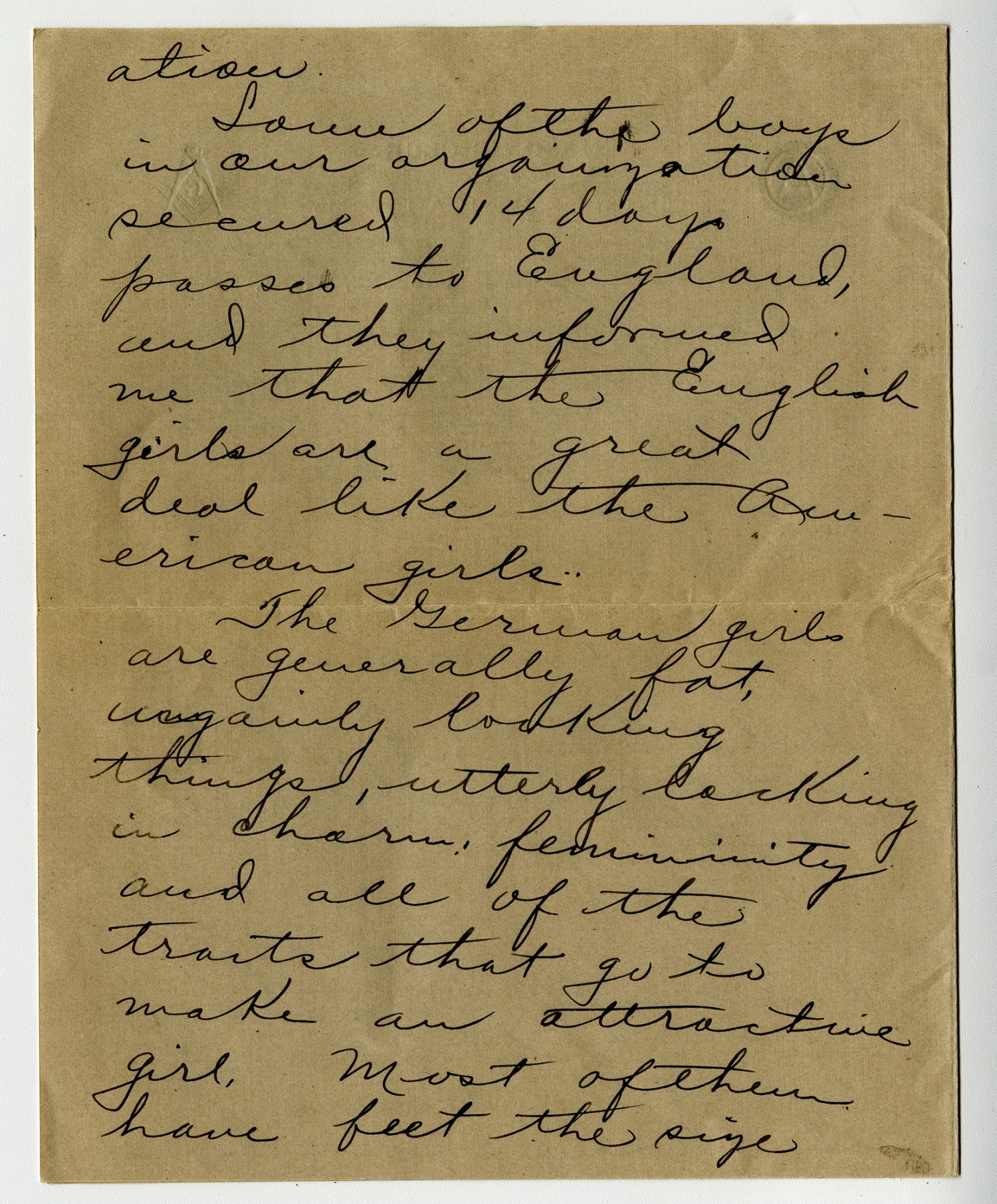 ation. Some of the boys in our organization secured 14 days passes to England, and they informed me that the English girls are a great deal like the American girls. The German girls are generally fat, ungainly looking things, utterly lacking in charm, femininity and all of the traits that go to make an attractive girl. Most of them have feet the size