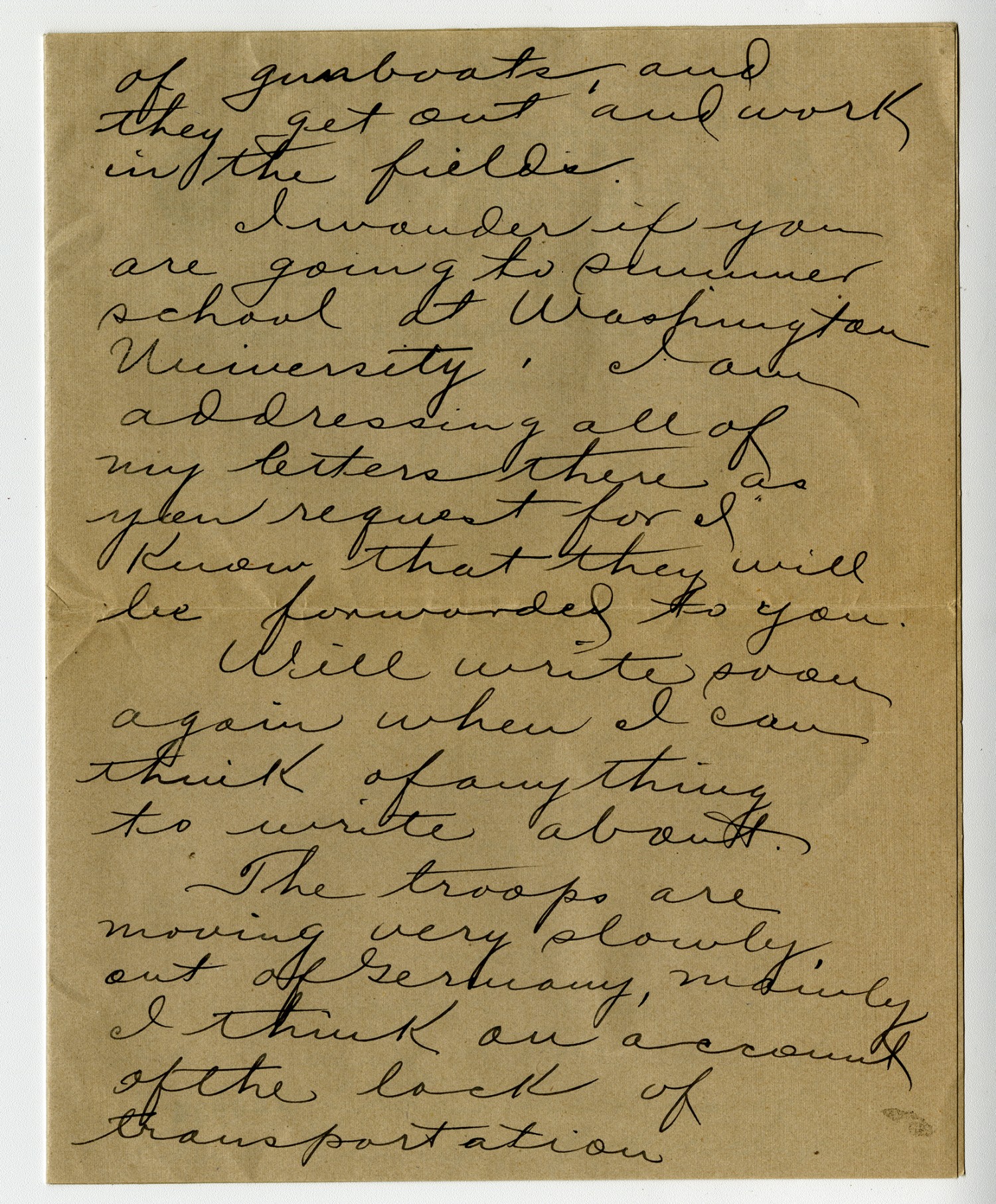 of gunboats, and they get out and work in the fields. I wonder if you are going to summer school at Washington University. I am addressing all of my letters there as you request for I know that they will be forwarded to you. Will write soon again when I can think of any thing to write about. The troops are moving very slowly, out of Germany, mainly I think on account of the lack of transportation