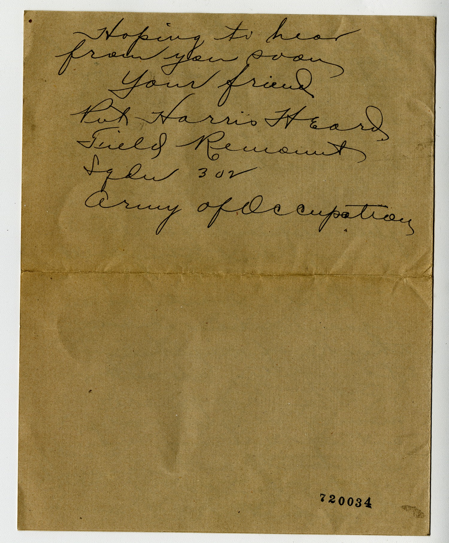 Hoping to hear from you soon Your friend Pvt. Harris Heard Field Remount Sqdn 302 Army of Occupation