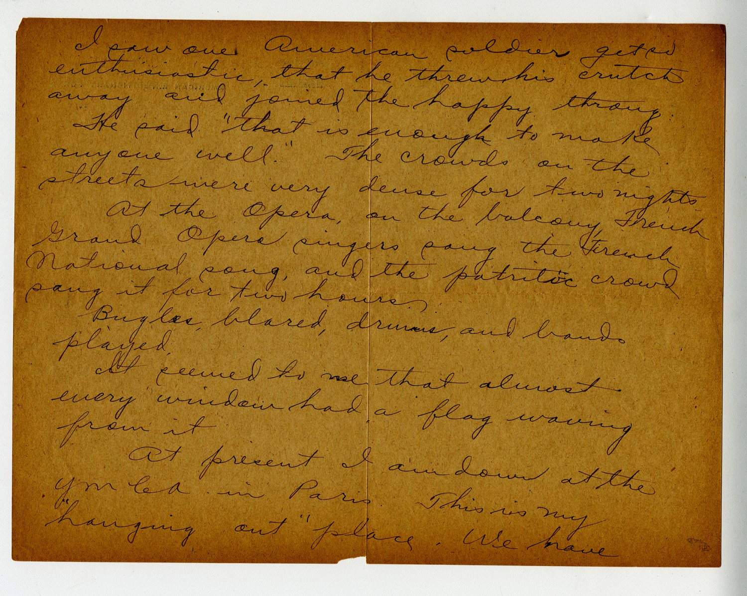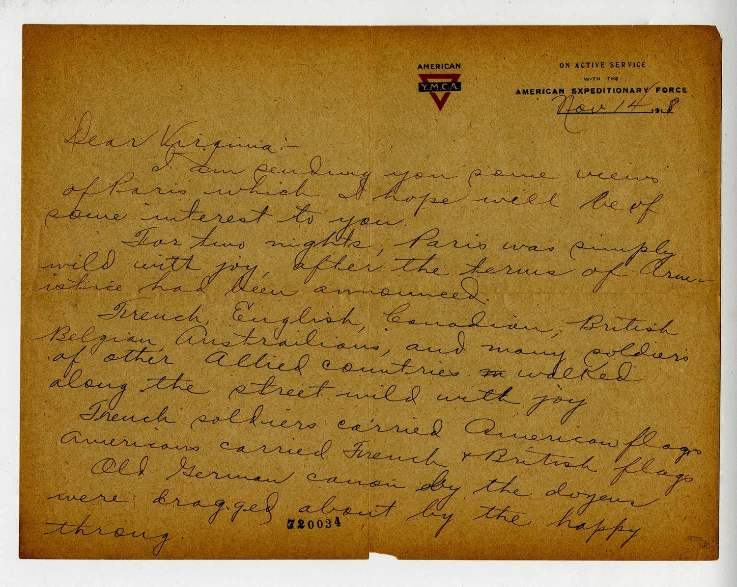 [November] 14 1918 Dear Virginia- I am sending you some views of Paris which I hope will be of some interest to you. For two nights, Paris was simply wild with joy, after the terms of Armistice had been announced. French, English, Canadian, British, Belgian, [Australians], and many soldiers of other Allied countries walked along the street wild with joy French soldiers carried American flags Americans carried French & British flags Old German canon by the dozens were dragged about by the happy throng.