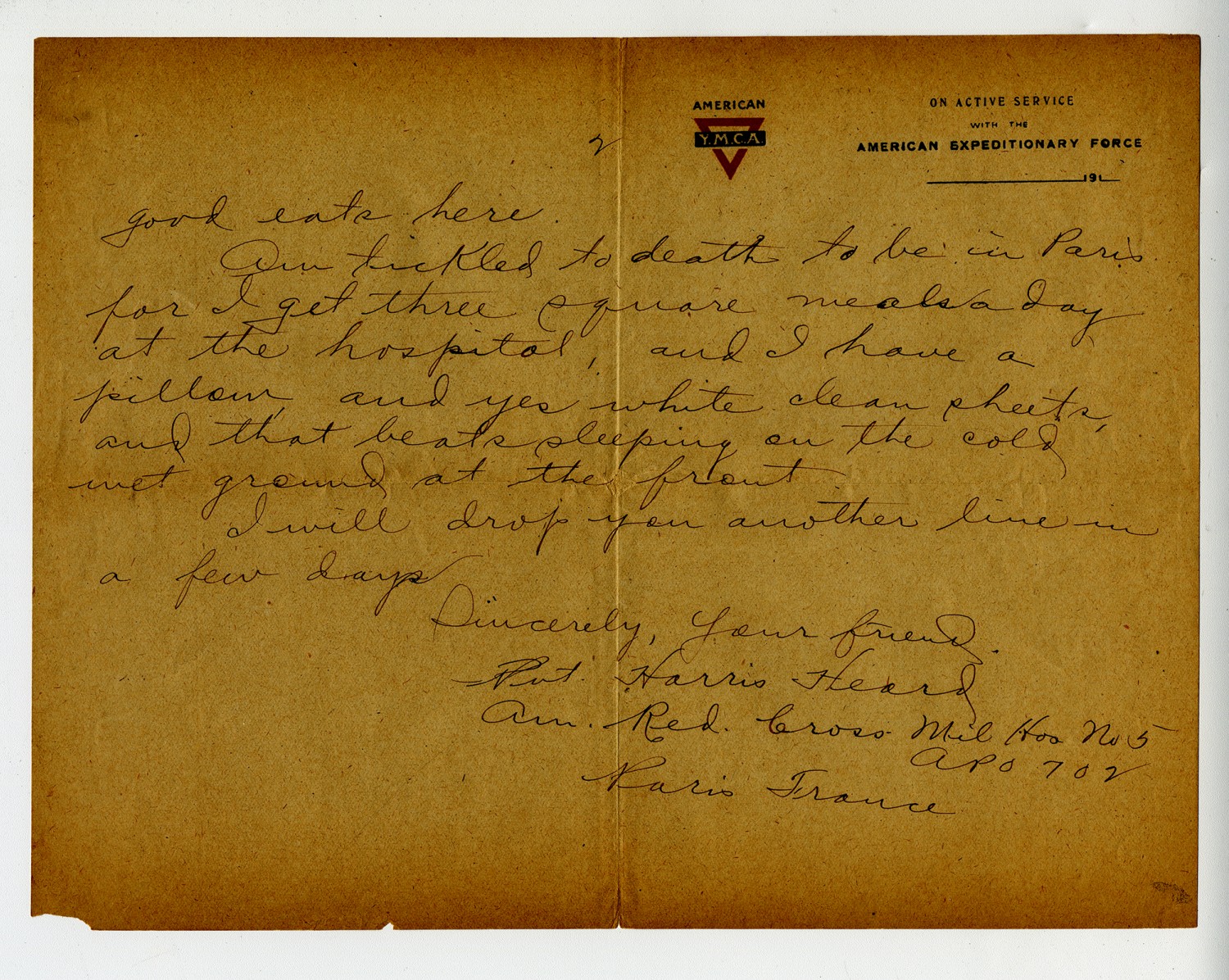 [page 2] good eats here. Am tickled to death to be in Paris for I get three square meals a day at the hospital, and I have a pillow and yes white clean sheets, and that beats sleeping on the cold wet ground at the front. I will drop you another line in a few days. Sincerely, Your friend. Pvt. Harris Heard Am. Red. Cross. Mil Hos No 5 APO 702 Paris France