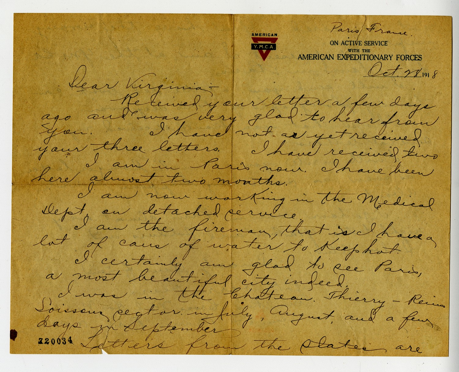 Paris, France [October] 28 1918 Dear Virginia- Received your letter a few days ago and was very glad to hear from you. I have not as yet received your three letters. I have received two I am in Paris now. I have been here almost two months. I am now working in the Medical Dept on detached service. I am the fireman, that is I have a lot of cans of water to keep hot. I certainly am glad to see Paris, a most beautiful city indeed. I was in the Chateau Thierry- Reimes Soissons sector in July, August, and a few days in September Letters from the States are