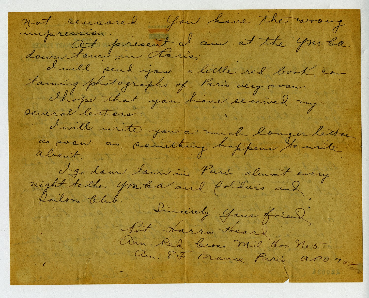 not censored. You have the wrong impression. At present I am at the Y.M.C.A. down town in Paris. I will send you a little red book containing photographs of Paris very soon. I hope that you have received my several letters. I will write you a much longer letter as soon as something happens to write about. I go down town in Paris about every night to the Y.M.C.A. and soldiers and Sailors Club. Sincerely your friend Pvt. Harris Heard Am. Red Cross Mil Hos. No 5 Am E.F. France Paris APO 702