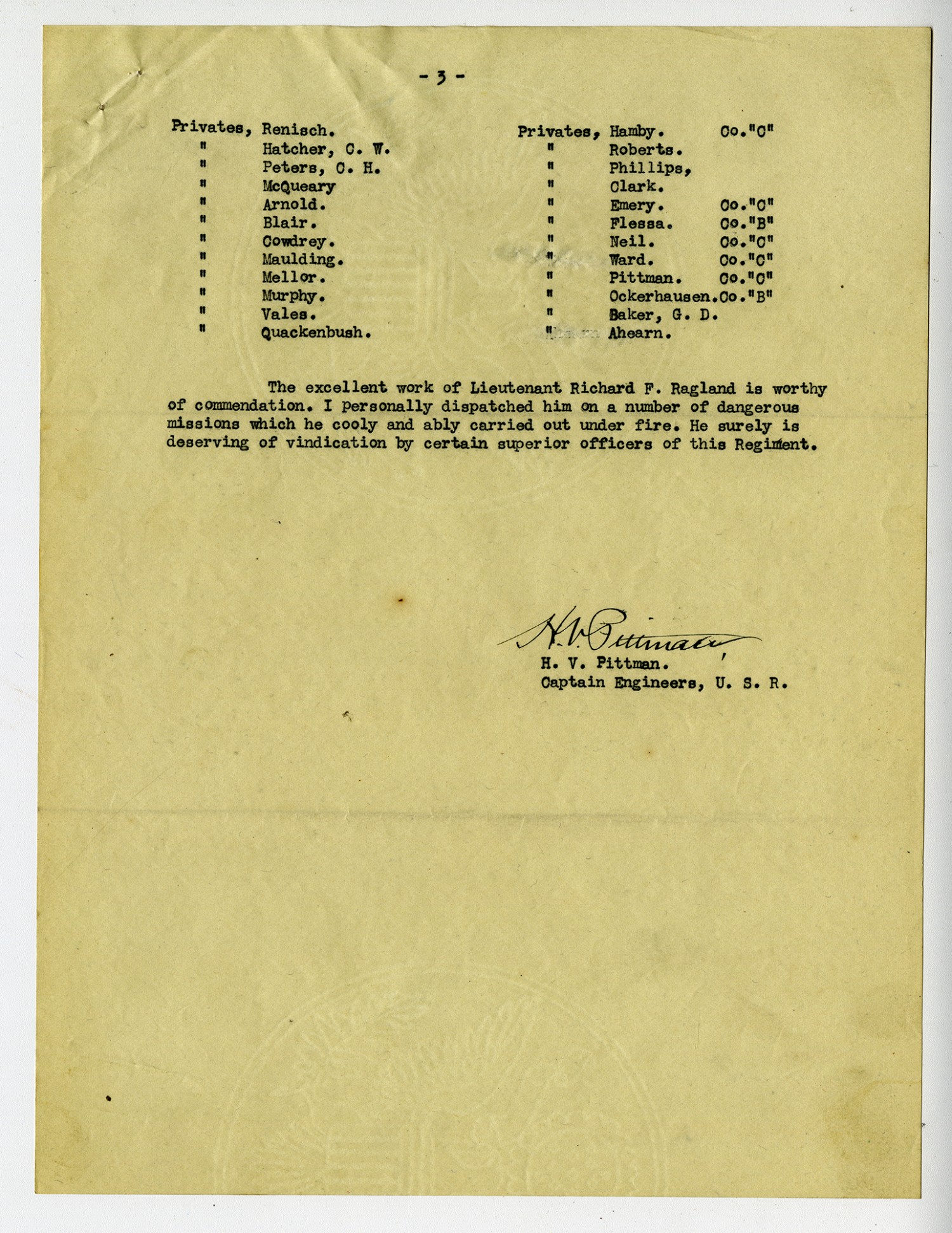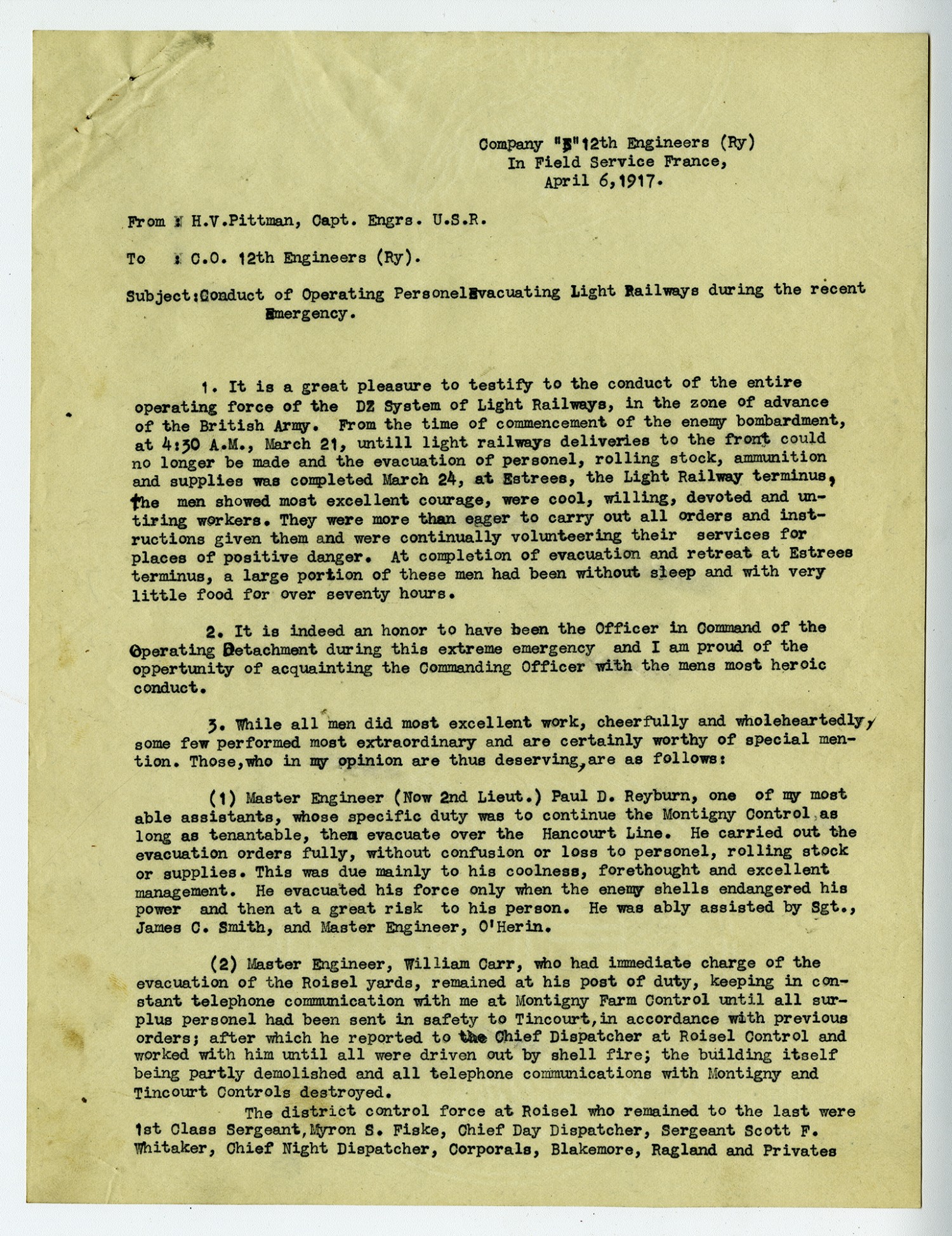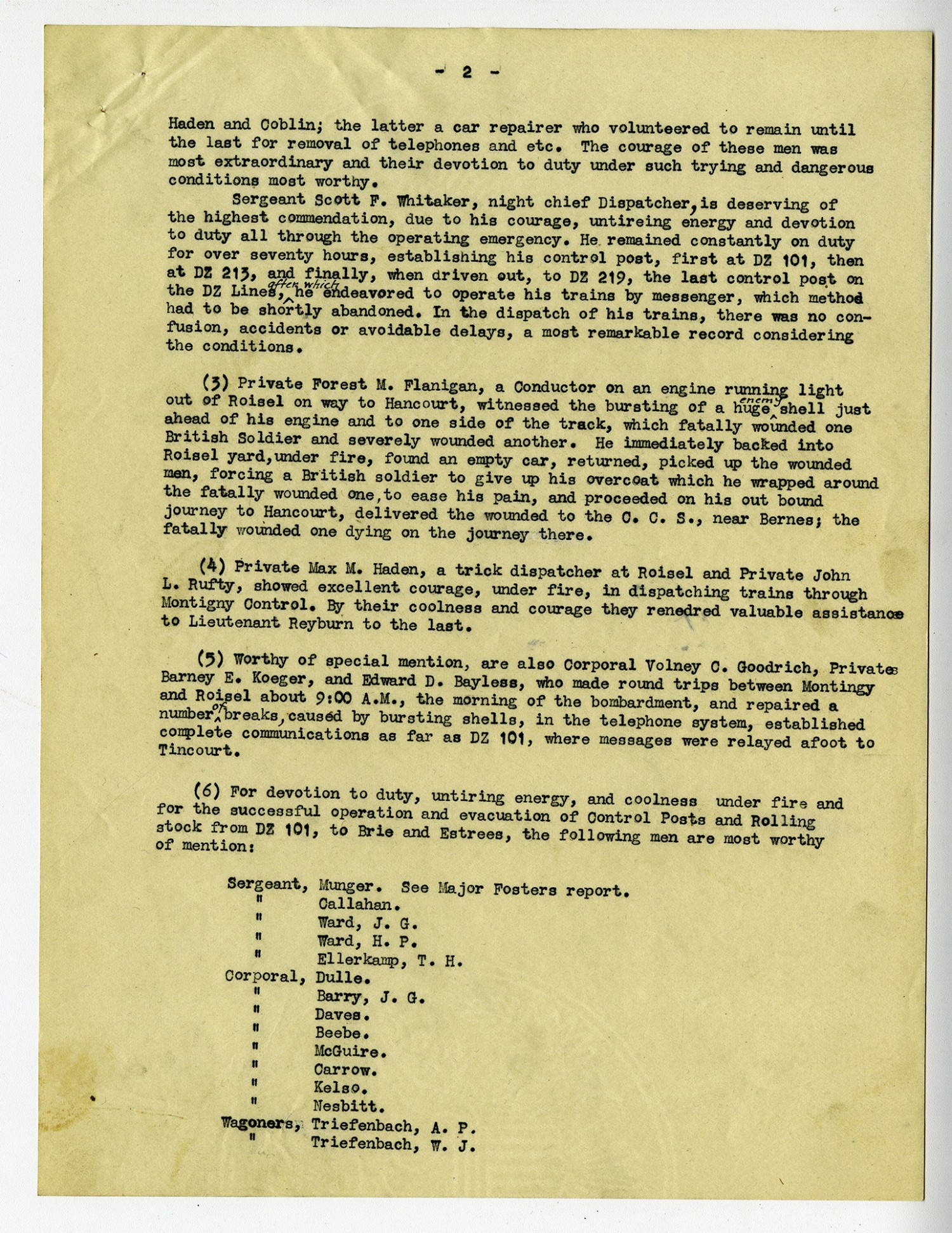 [page 2] Haden and Coblin; the latter a car repairer who volunteered to remain until the last for removal of telephones and etc. The courage of these men was most extraordinary and their devotion to duty under such trying and dangerous conditions most worthy. Sergeant Scott F. Whitaker, night chief Dispatcher, is deserving of the highest commendation, due to his courage, untireing energy and devotion to duty all through the operating emergency. He remained constantly on duty for over seventy hours, establishing his control post, first at DZ 101, then at DZ 213, and finally, when driven out, to DZ 219, the last control post on the DZ Lines, after which he endeavored to operate his trains by messenger, which method had to be shortly abandoned. In the dispatch of his trains, there was no confusion, accidents or avoidable delays, a most remarkable record considering the conditions. (3) Private Forest M. Flanigan, a Conductor on an engine running light out of Roisel on way to Hancourt, witnessed the bursting of a huge enemy shell just ahead of his engine and to one side of the track, which fatally wounded one British Soldier and severely wounded another. He immediately backed into Roisel yard, under fire, found an empty car, returned, picked up the wounded men, forcing a British soldier to give up his overcoat which he wrapped around the fatally wounded one, to ease his pain, and proceeded on his out bound journey to Hancourt, delivered the wounded to the C.C.S., near Bernes; the fatally wounded one dying on the journey there. (4) Private Max M. Haden, a trick dispatcher at Roisel and Private John L. Rufty, showed excellent courage, under fire, in dispatching trains through Montigny Control. By their coolness and courage they renedred valuable assistance to Lieutenant Reyburn to the last. (5) Worthy of special mention, are also Corporal Volney C. Goodrich, Privates Barney E. Koeger, and Edward D. Bayless, who made round trips between Montingy and Roisel about 9:00 A.M., the morning of the bombardment, and repaired a number of breaks, caused by bursting shells, in the telephone system, established complete communications as far as DZ 101, where messages were relayed afoot to Tincourt. (6) For devotion to duty, untiring energy, and coolness under fire and for the successful operation and evacuation of Control Posts and Rolling stock from DZ 101, to Brie and Estrees, the following men are most worthy of mention: Sergeant, Munger. See Major Fosters report. Sergeant, Callahan. Sergeant, Ward, J.G. Sergeant, Ward, H.P. Sergeant, Ellerkamp, T.H. Corporal, Dulle Corporal, Barry, J.G. Corporal, Daves. Corporal, Beebe. Corporal, McGuire. Corporal, Carrow, Corporal, Kelso. Corporal, Nesbitt. Wagoners, Triefenbach, A.P. Wagoners, Triegenbach, W.J.