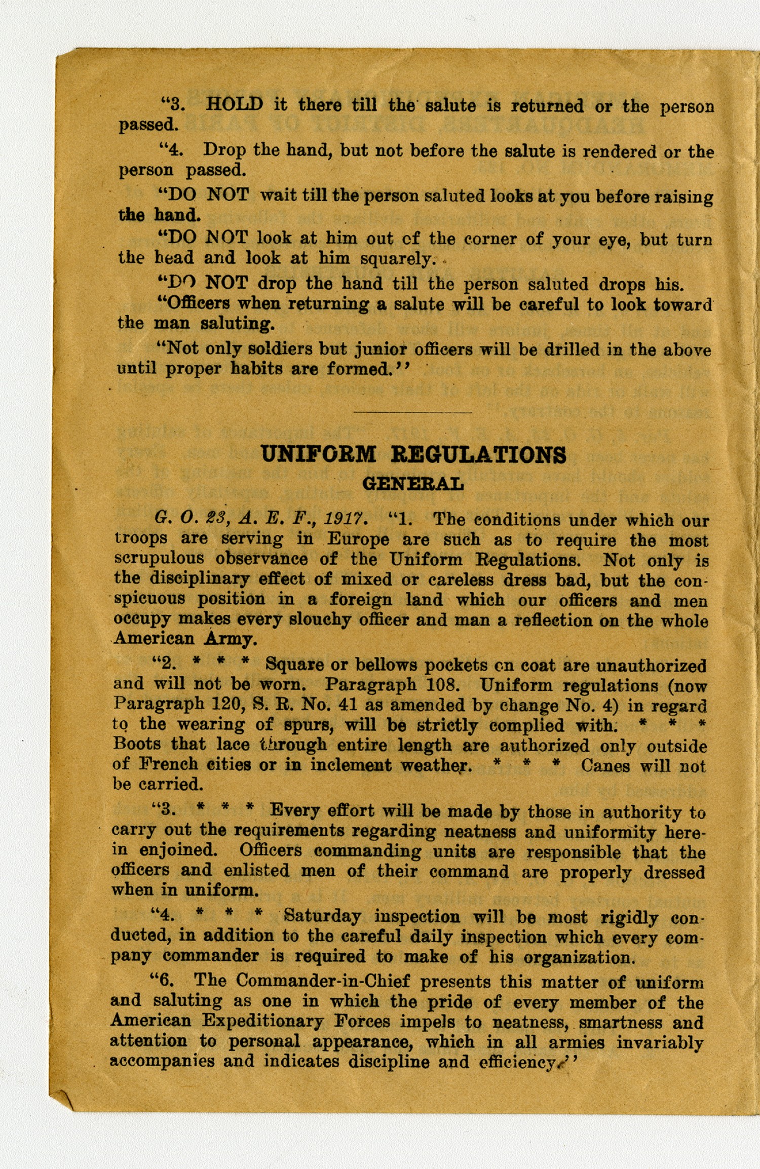 American Expeditionary Forces Headquarters, District of Paris Memorandum NO. 123. There is republished for the information and guidance of officers, other ranks and militarized civilians the following pertinent orders and regulations on saluting, military courtesies and uniform: Salutes and Courtesies Par. 6, A.R. 406.