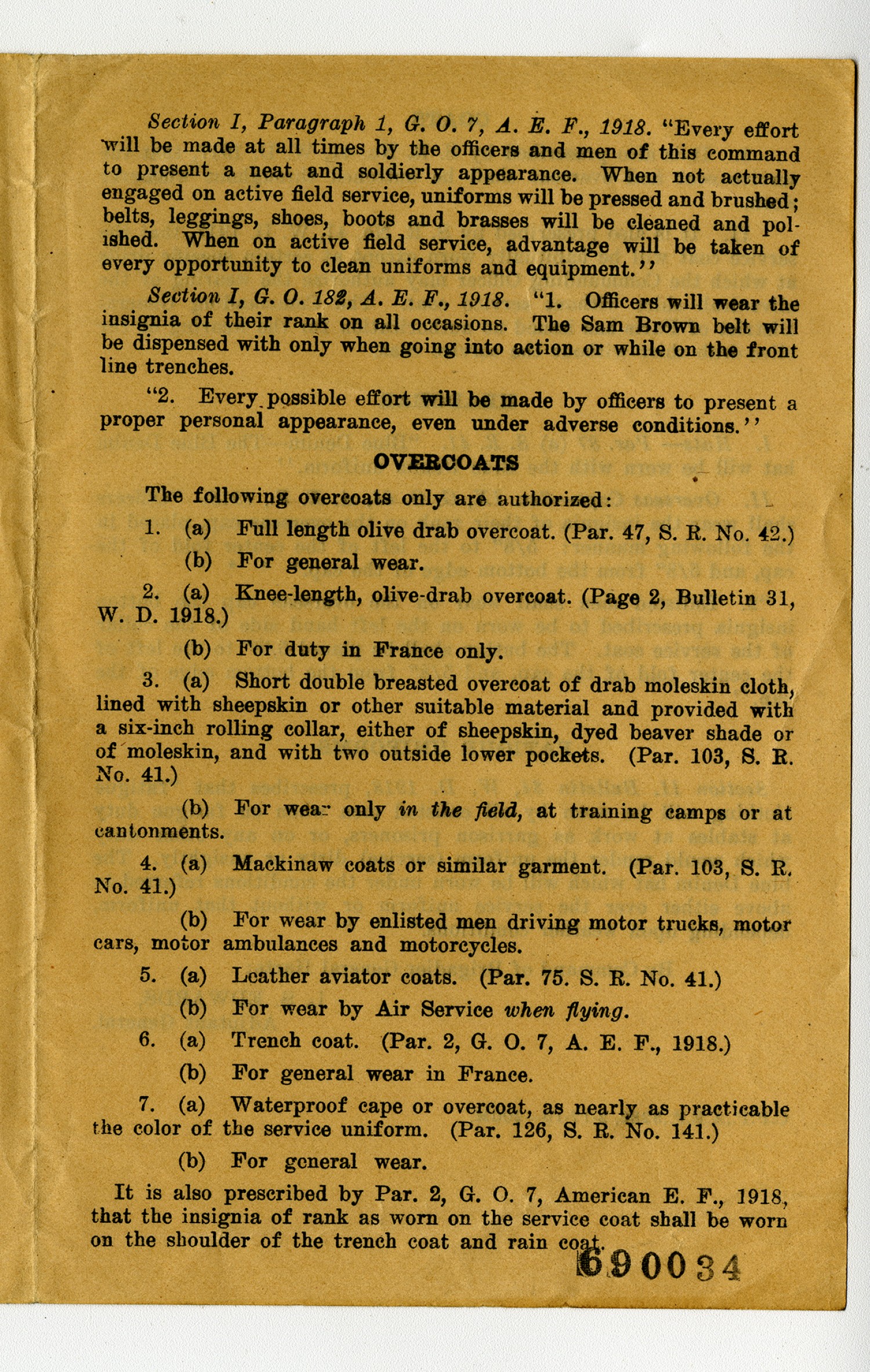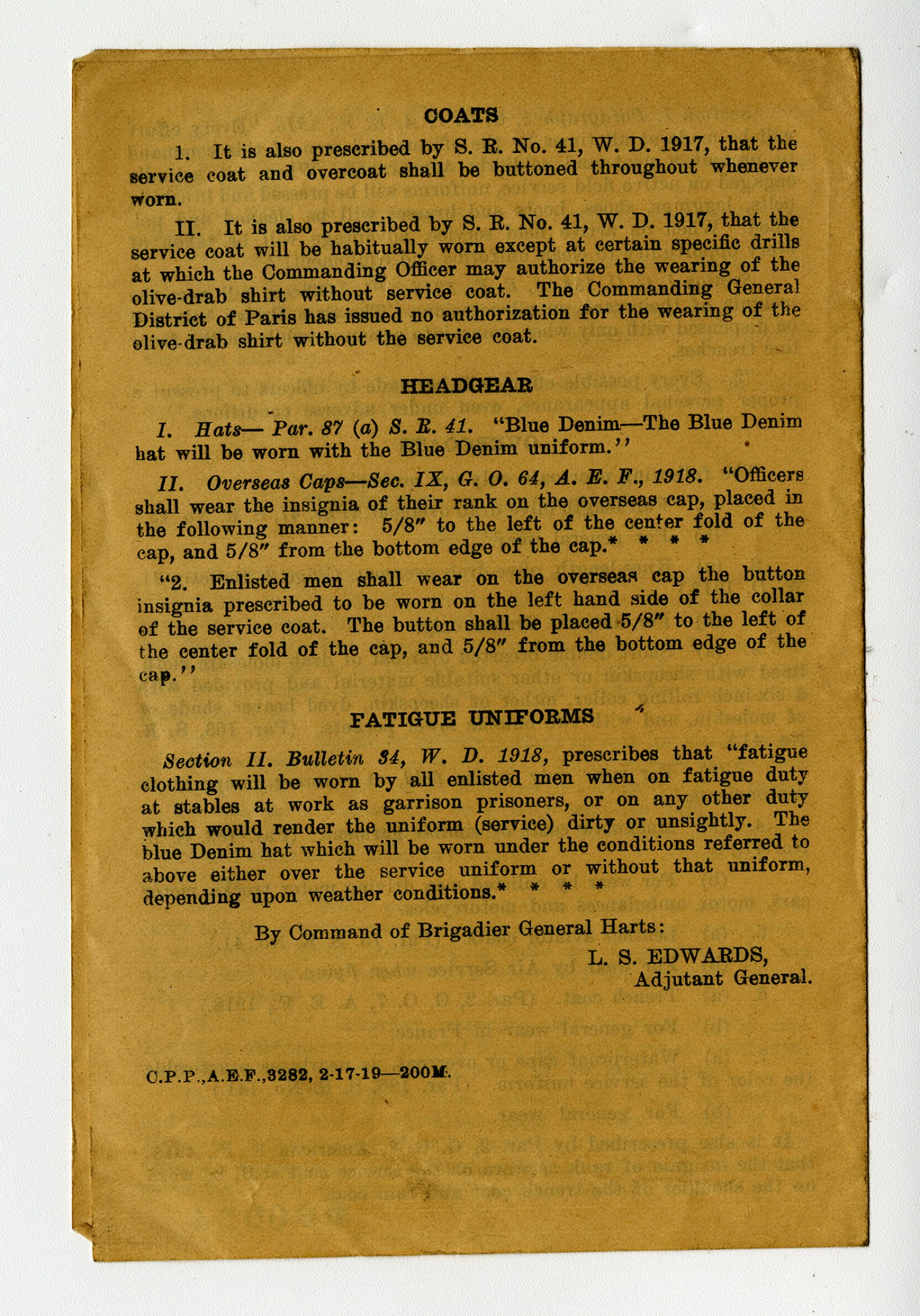Coats 1. It is also prescribed by S.R. No. 41, W.D. 1917, that the service coat and overcoat shall be buttoned throughout whenever worn. II. It is also prescribed by S.R. No. 41, W.D. 1917, that the service coat will be habitually worn except at certain specific drills at which the Commanding Officer may authorize the wearing of the olive-drab shirt without service coat. The Commanding General District of Paris has issued no authorization for the wearing of the olive-drab shirt without the service coat. Headgear I. Hats-Par. 87 (a) S.R. 41.