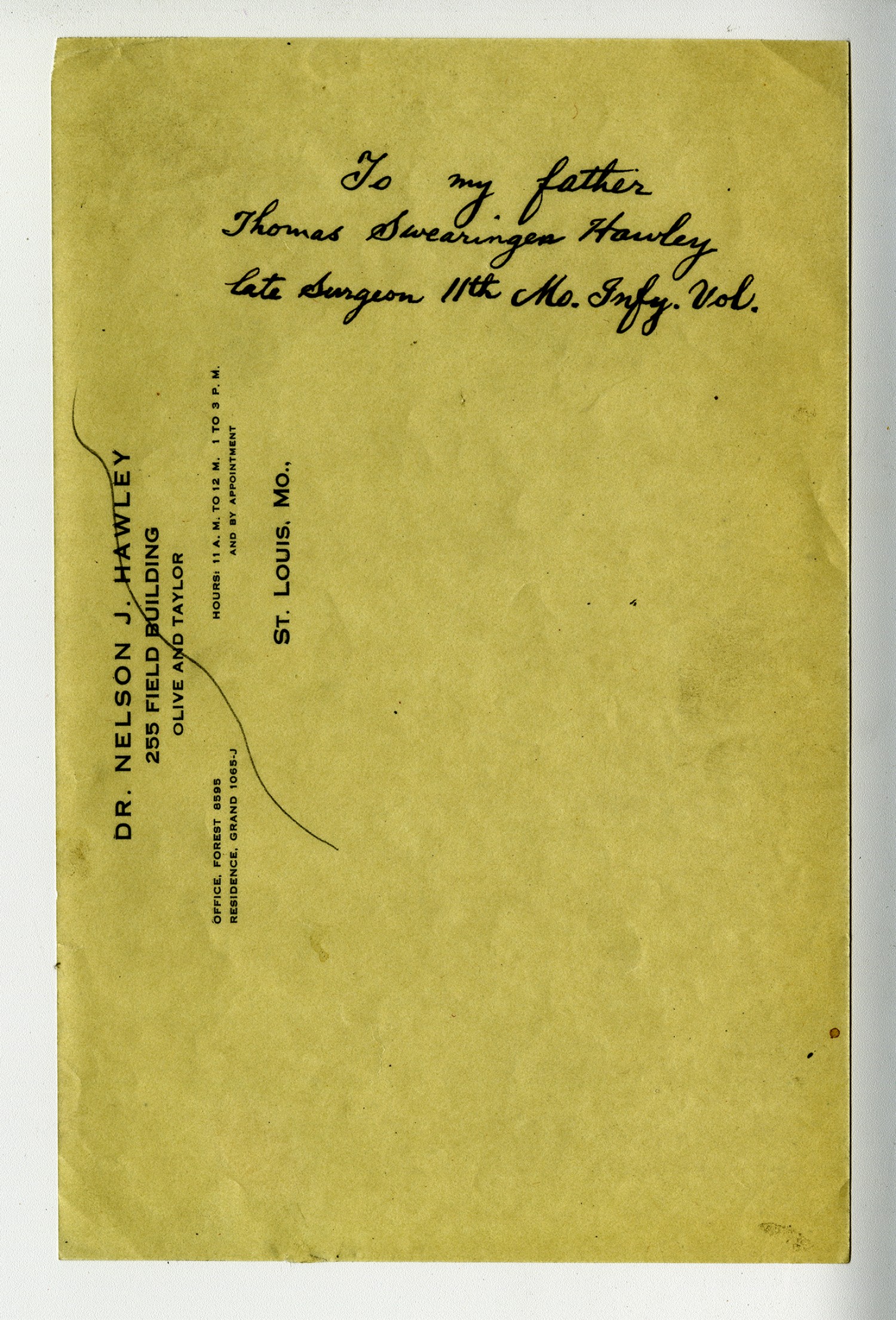 To my father Thomas Swearinges Hawley late Surgeon 11th [Missouri] Infy. Vol.
