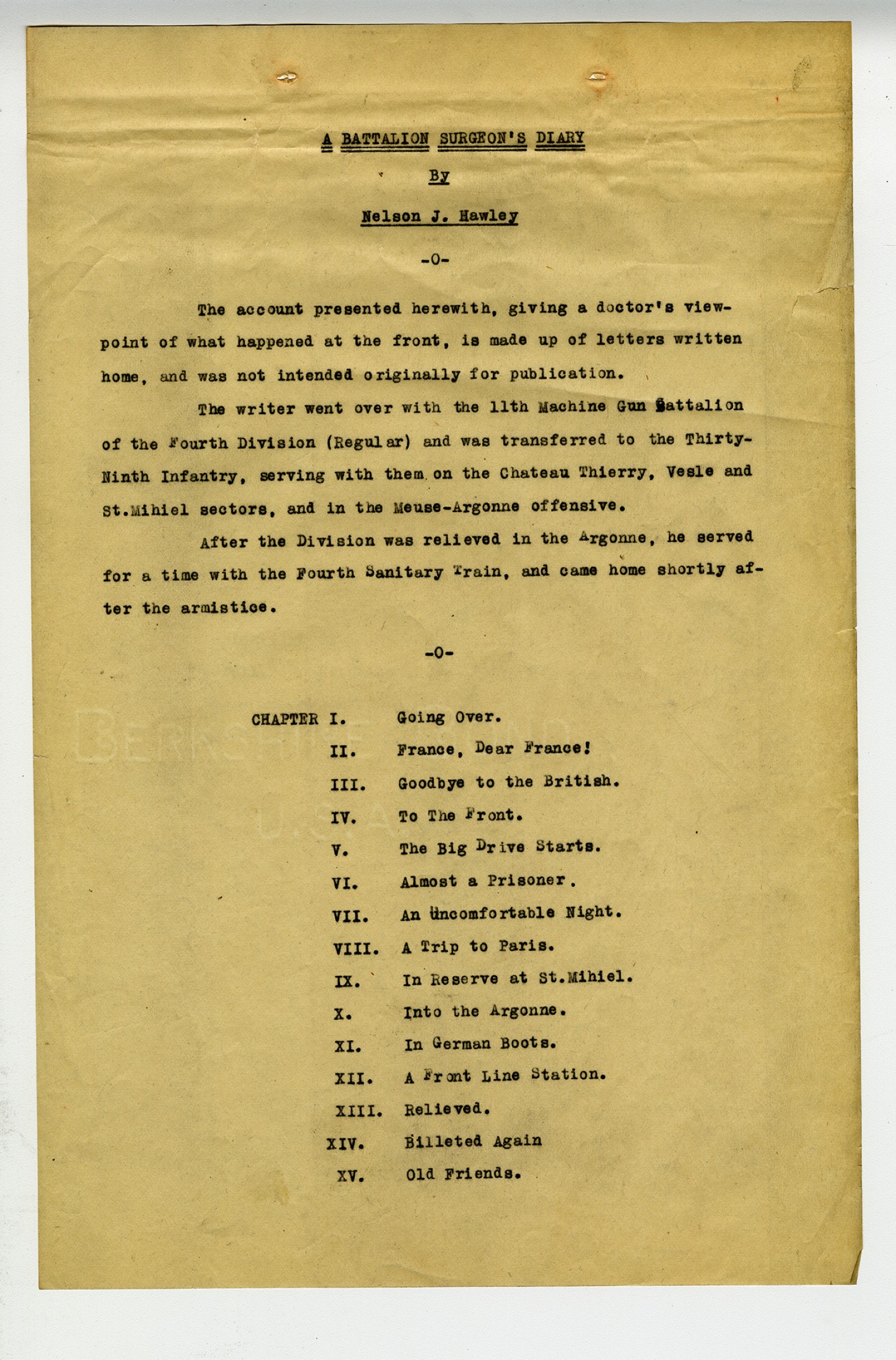 | Source | Hawley, Nelson J. Battalion Surgeon's Diary. 10 May 1918- 16 November 1918. World War I Collection. A1771. Missouri History Museum, St. Louis, Missouri. |