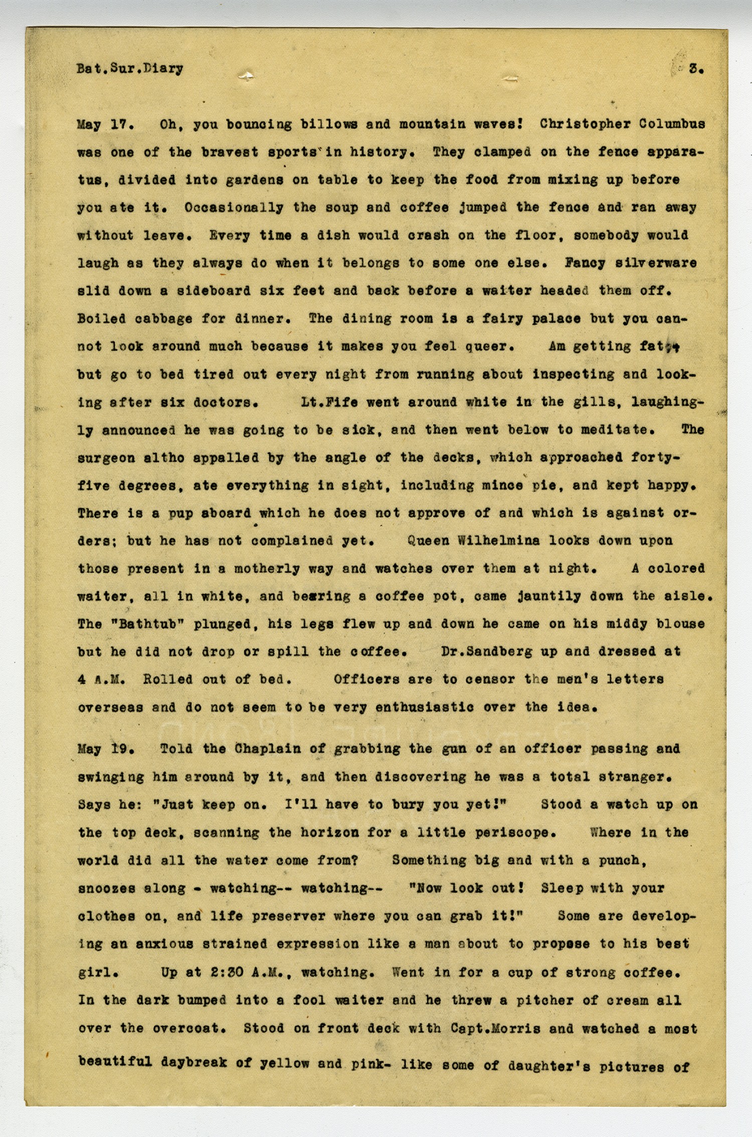 [page 3] Bat. Sur. Diary May 17. Oh, you bouncing billows and mountain waves! Christopher Columbus was one of the bravest sports in history. They clamped on the fence apparatus, divided into gardens on table to keep the food from mixing up before you ate it. Occasionally the soup and coffee jumped the fence and ran away without leave. Every time a dish would crash on the floor, somebody would laugh as they always do when it belongs to some one else. Fancy silverware slid down a sideboard six feet and back before a waiter headed them off. Boiled cabbage for dinner. The dining room is a fairy palace but you cannot look around much because it makes you feel queer. Am getting fat, but go to bed tired out every night from running about inspecting and looking after six doctors. Lt. Fife went around white in the gills, laughingly announced he was going to be sick, and then went below to meditate. The surgeon altho appalled by the angle of the decks, which approached forty-five degrees, ate everything in sight, including mince pie, and kept happy. There is a pup aboard which he does not approve of and which is against orders; but he has not complained yet. Queen Wilhelmina looks down upon those present in a motherly way and watches over them at night. A colored waiter, all in white, and bearing a coffee pot, cam jauntily down the aisle. The
