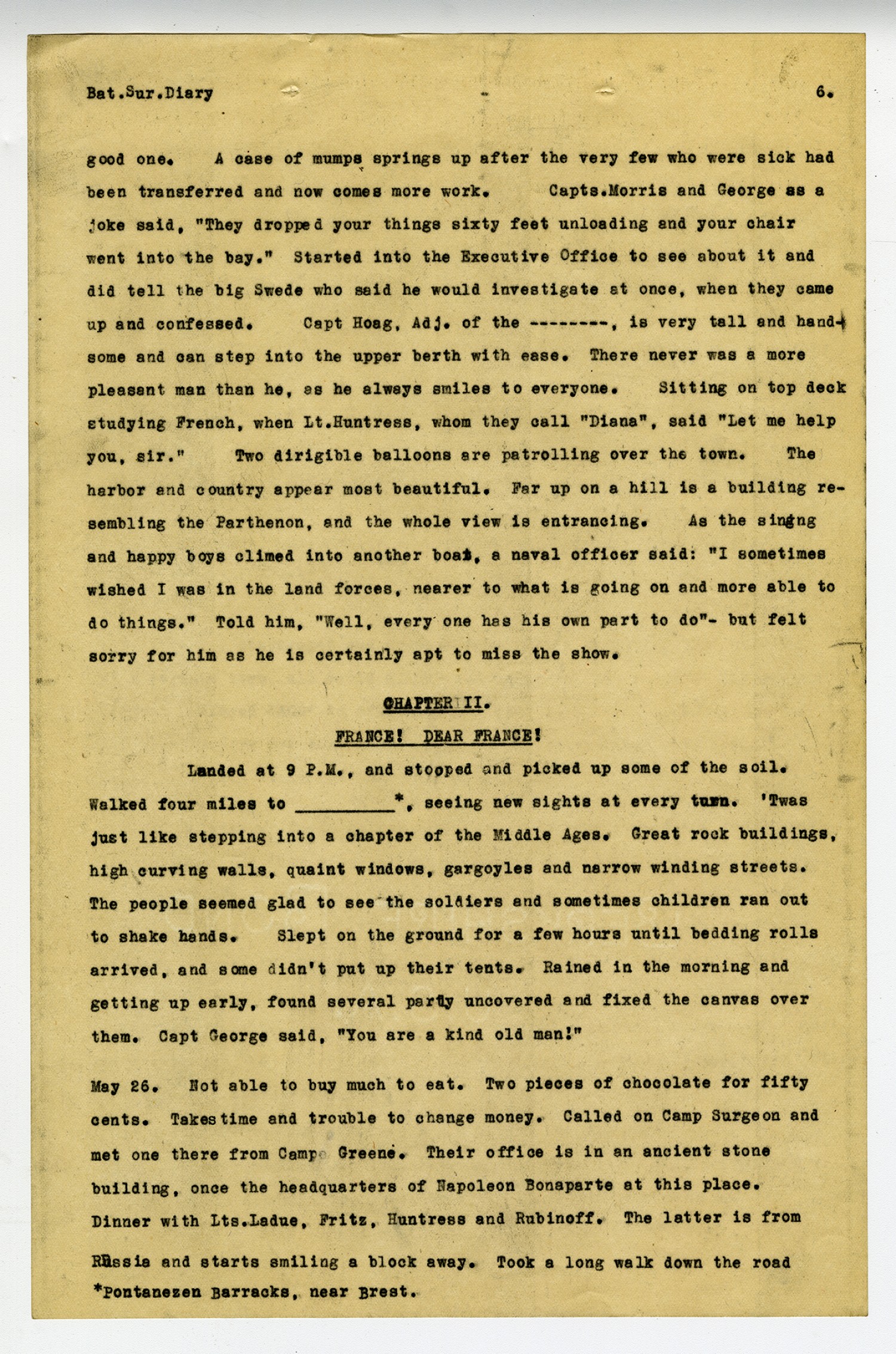 [page 6] Bat. Sur Diary good one. A case of mumps springs up after the very few who were sick had been transferred and now comes more work. Capts. Morris and George as a joke said,