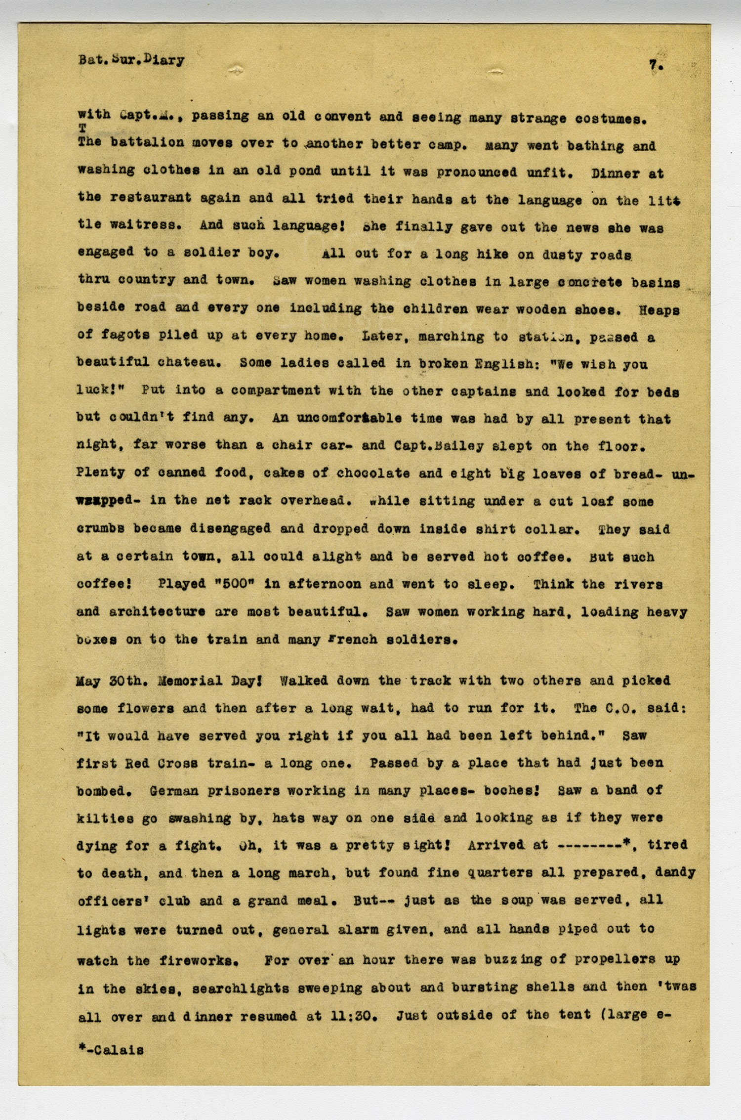 [page 7] Bat. Sur. Diary with Capt. M., passing an old convent and seeing many strange costumes. The battalion moves over to another better camp. Many went bathing and washing clothes in an old pond until it was pronounced unfit. Dinner at the restaurant again and all tried their hands at the language on the little waitress. And such language! She finally gave out the news she was engaged to a soldier boy. All out for a long hike on dusty roads thru country and town. Saw women washing clothes in large concrete basins beside road and every one including the children wear wooden shoes. Heaps of fagots piled up at every home. Later, marching to station, passed a beautiful chateau. Some ladies called in broken English:
