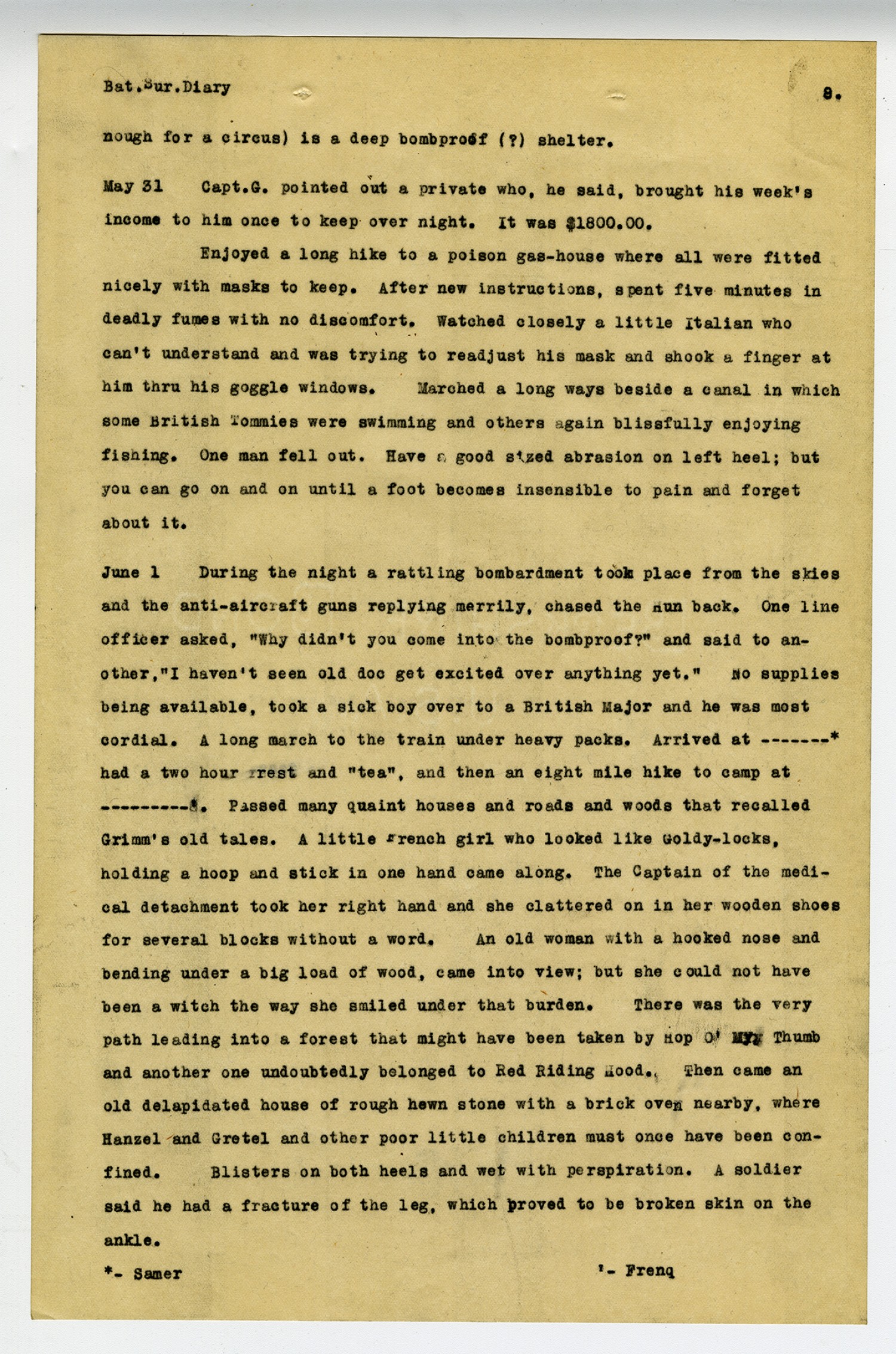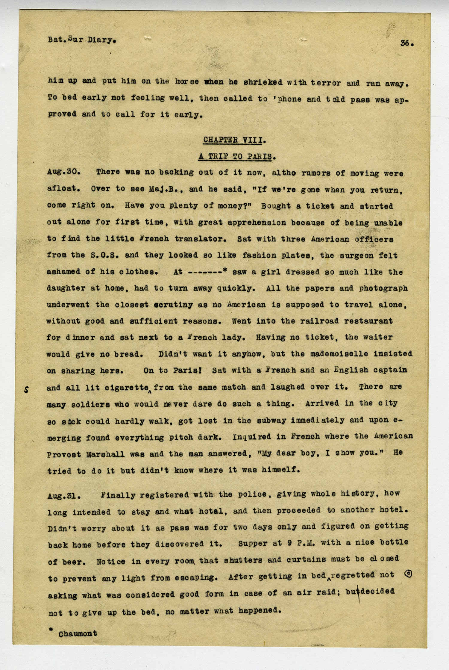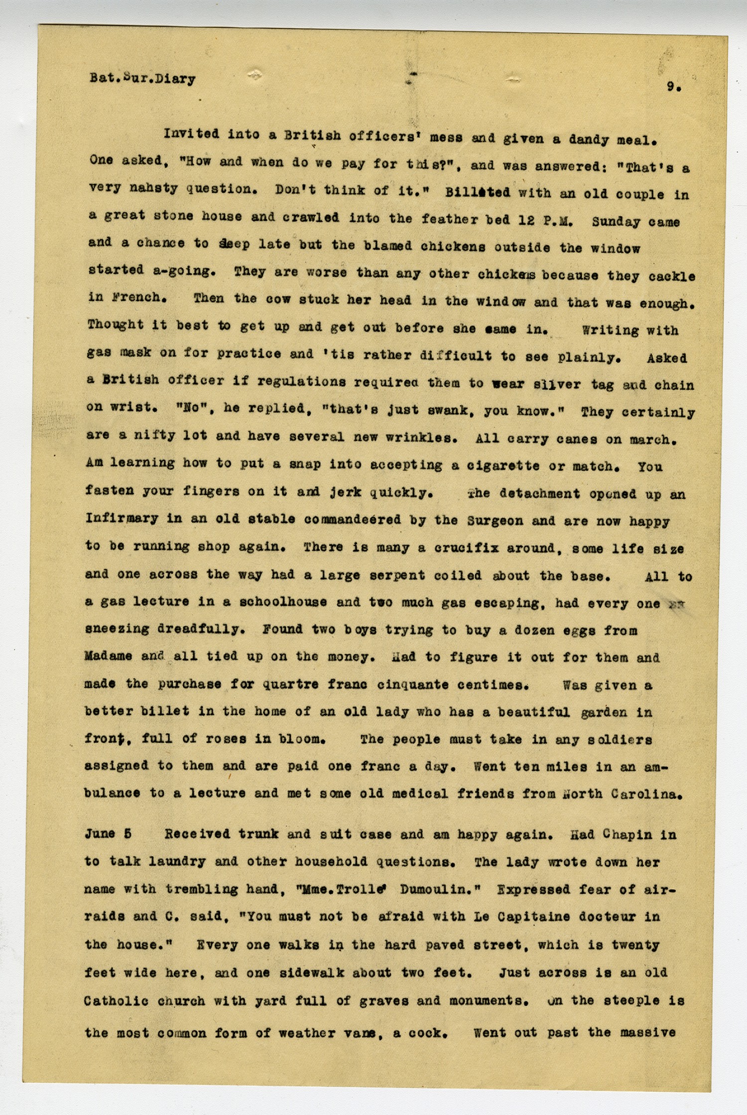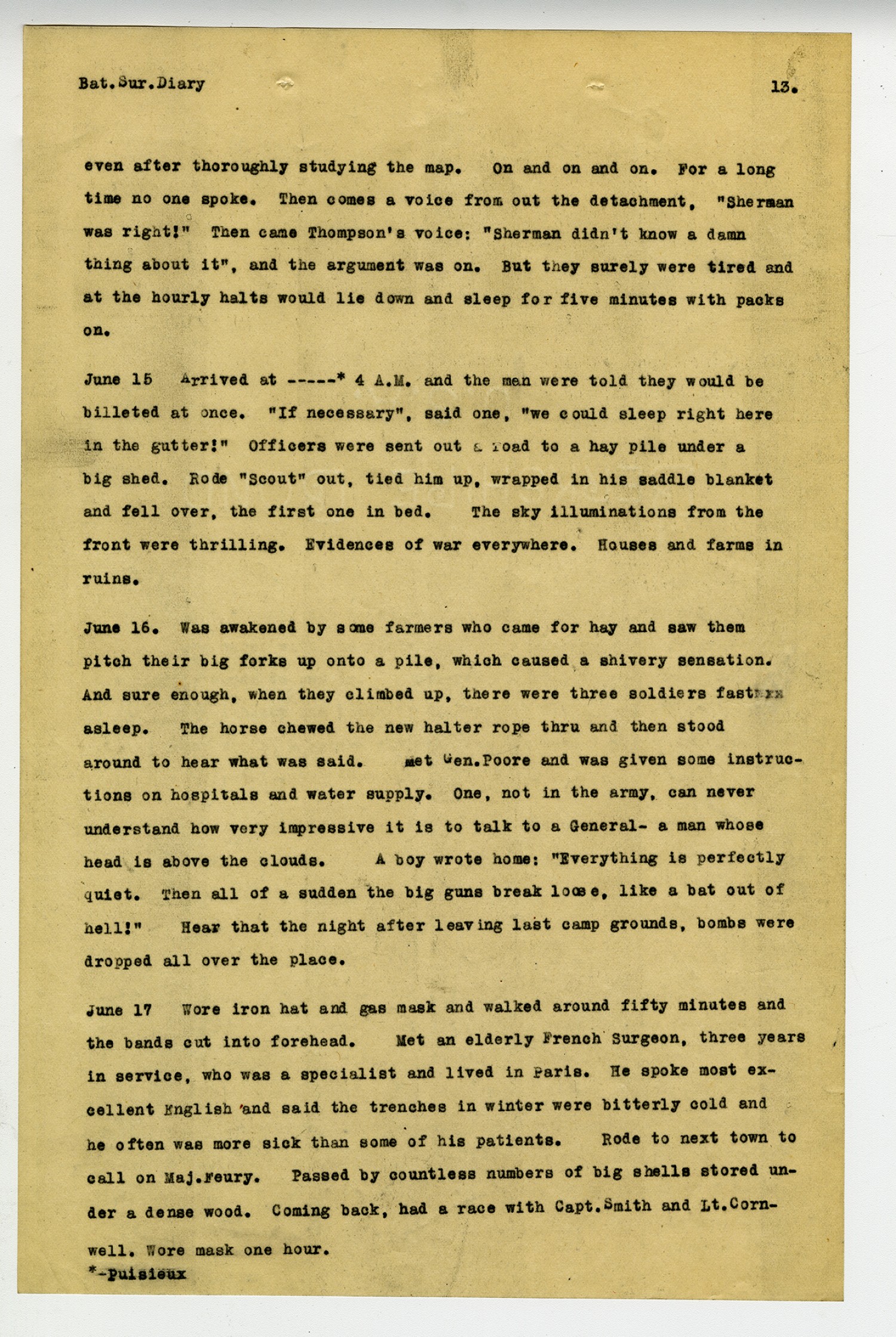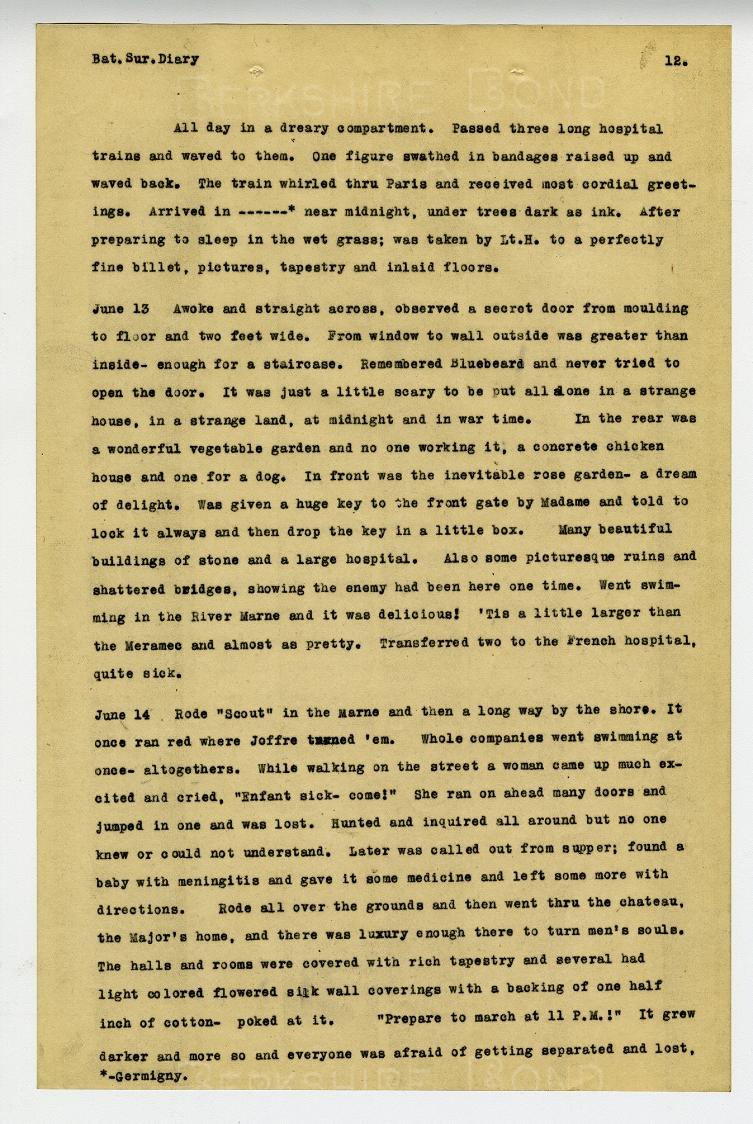 [page 12] Bat. Sur. Diary All day in a dreary compartment. Passed three long hospital trains and waved to them. One figure swathed in bandages raised up and waved back. The train whirled thru Paris and received most cordial greetings. Arrived in ----* near midnight, under trees dark as ink. After preparing to sleep in the wet grass; was taken by Lt. H. to a perfectly fine billet, pictures, tapestry and inlaid floors. June 13 Awoke and straight across, observed a secret door from moulding to floor and two feet wide. From window to wall outside was greater than inside-enough for a staircase. Remembered Bluebeard and never tried to open the door. It was just a little scary to be put all alone in a strange house, in a strange land, at midnight and in war time. In the rear was a wonderful vegetable garden and no one working it, a concrete chicken house and one for a dog. In front was the inevitable rose garden-a dream of delight. Was given a huge key to the front gate by Madame and told to lock it always and then drop the key in a little box. Many beautiful buildings of stone and a large hospital. Also some picturesque ruins and shattered bridges, showing the enemy had been here one time. Went swimming in the River Marne and it was delicious!