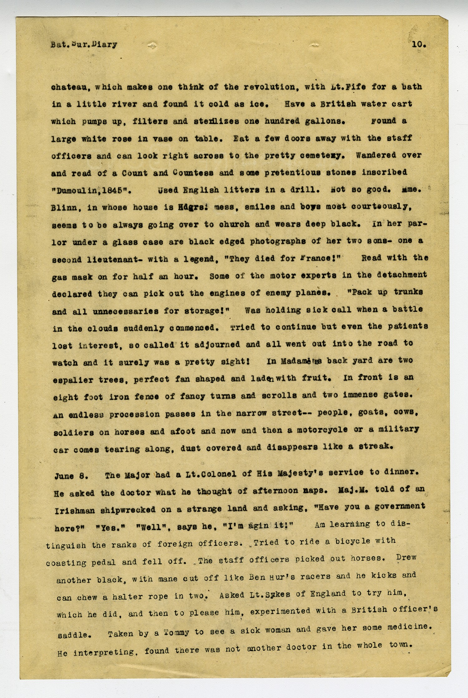 [page 10] Bat. Sur. Diary chateau, which makes one think of the revolution, with Lt. Fife for a bath in a little river and found it cold as ice. Have a British water cart which pumps up, filters and sterilizes one hundred gallons. Found a large white rose in vase on table. Eat a few doors away with the staff officers and can look right across to the pretty cemetery. Wandered over and read of a Count and Countess and some pretentious stones inscribed