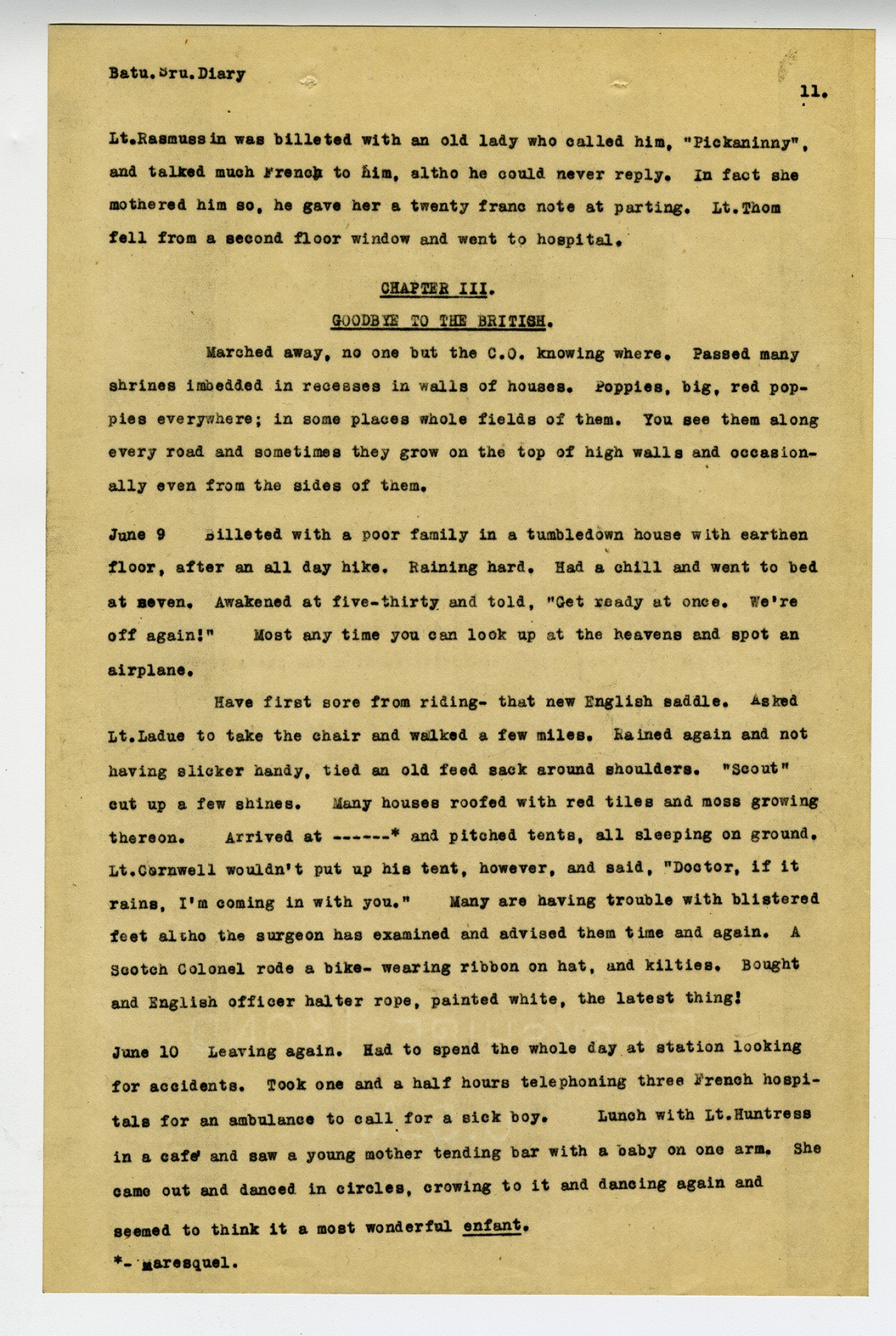 [page 11] Batu. Sru. Diary Lt. Rasmussin was billeted with an old lady who called him,