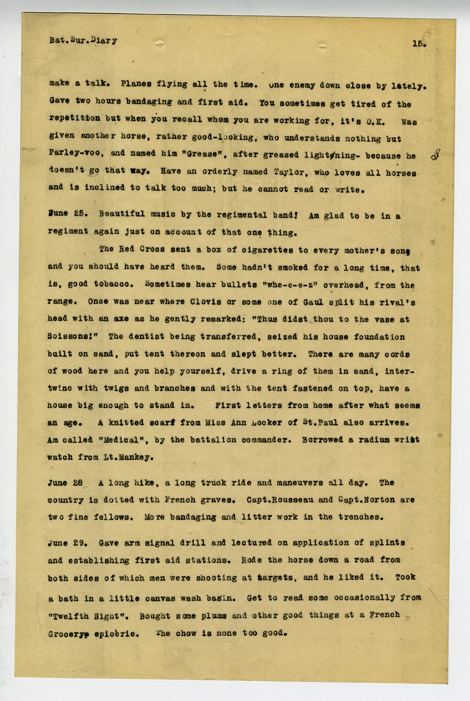 [page 14] Bat. Sur. DiaryJune 18 Being unable to get a Red Cross flag as far in spite of all endeavor; ordered the boys to cut one out of flannel and sew it on a towel. Done. Hearing of a bunch of tanks up the road went to investigate and found a whole nest full. An officer called someone who said he had served in the American Navy and he explained everything in a most interesting way. Six go out on trips-one a surgeon. June 19. Noticed many front doors here had a round three inch hold near the bottom and wondered over it until one night, happened to see a cat going home. Rain. Had litter drill in and out of wire entanglements. Dentist Rasmussin did some work. Said teeth were in good shape. Found a patch of strawberries and they had a wine flavor. Playing with Capt. Morris and swung around with the steel hat, striking the wrist watch and of course it broke. Put one of the boys under arrest for talking in line and told them it was shocking they had not learned to obey e