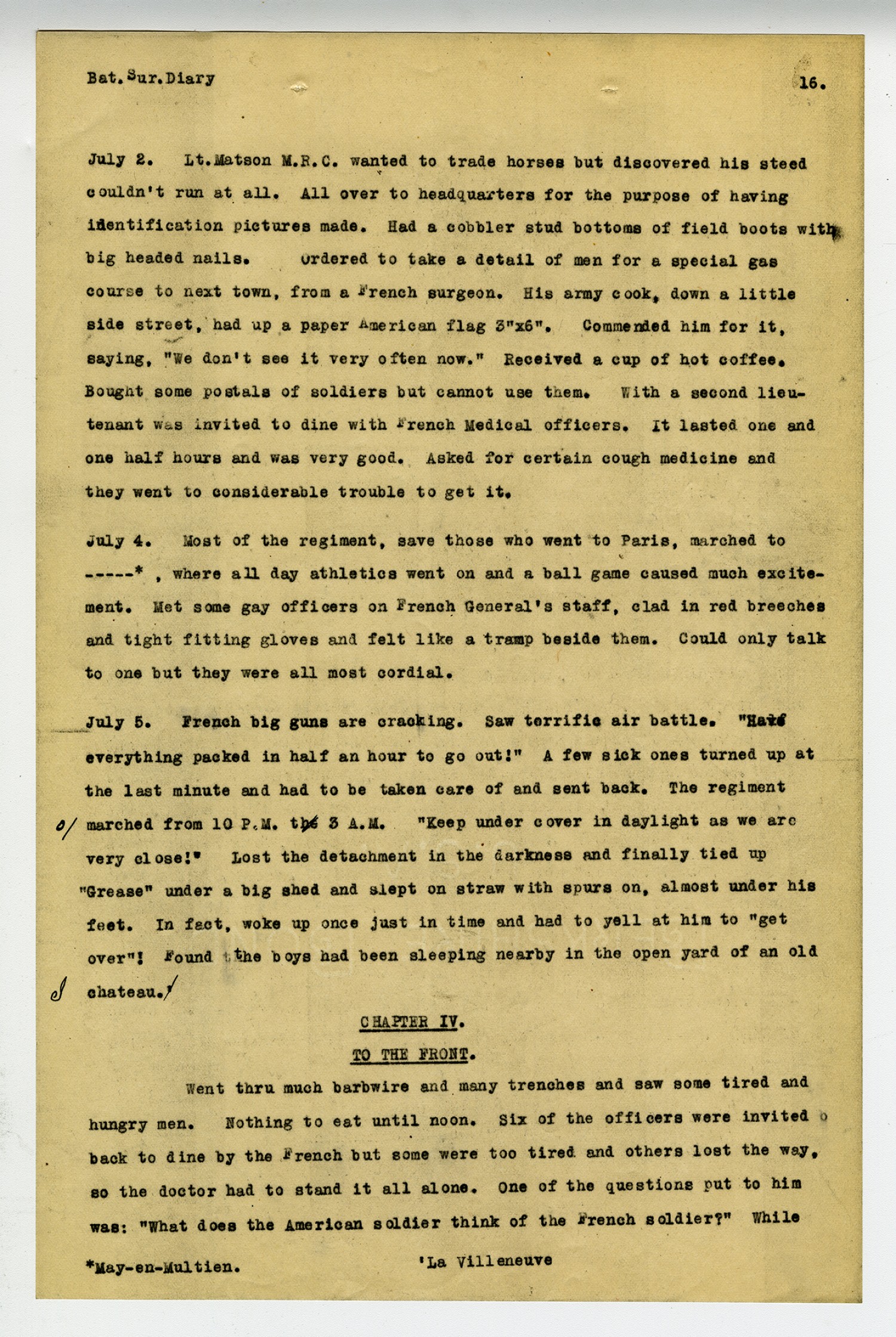 [page 16] Bat. Sur. Diary July 2. Lt. Matson M.R.C. wanted to trade horses but discovered his steed couldn