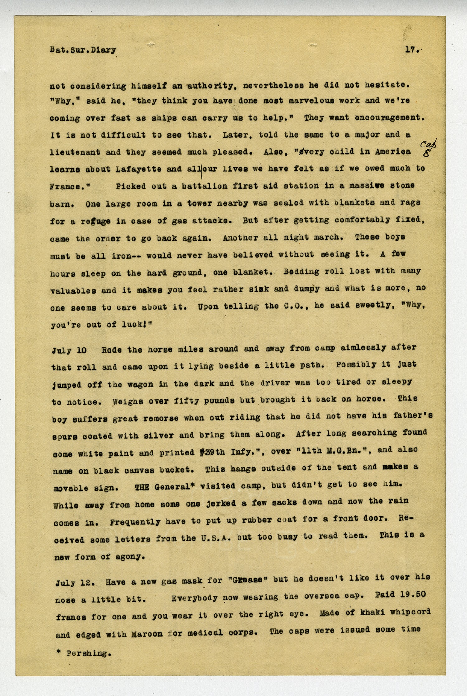 [page 18] Bat. Sur. Diary ago but the few who ventured to wear them before the order came, received a beautiful bawling out. Always