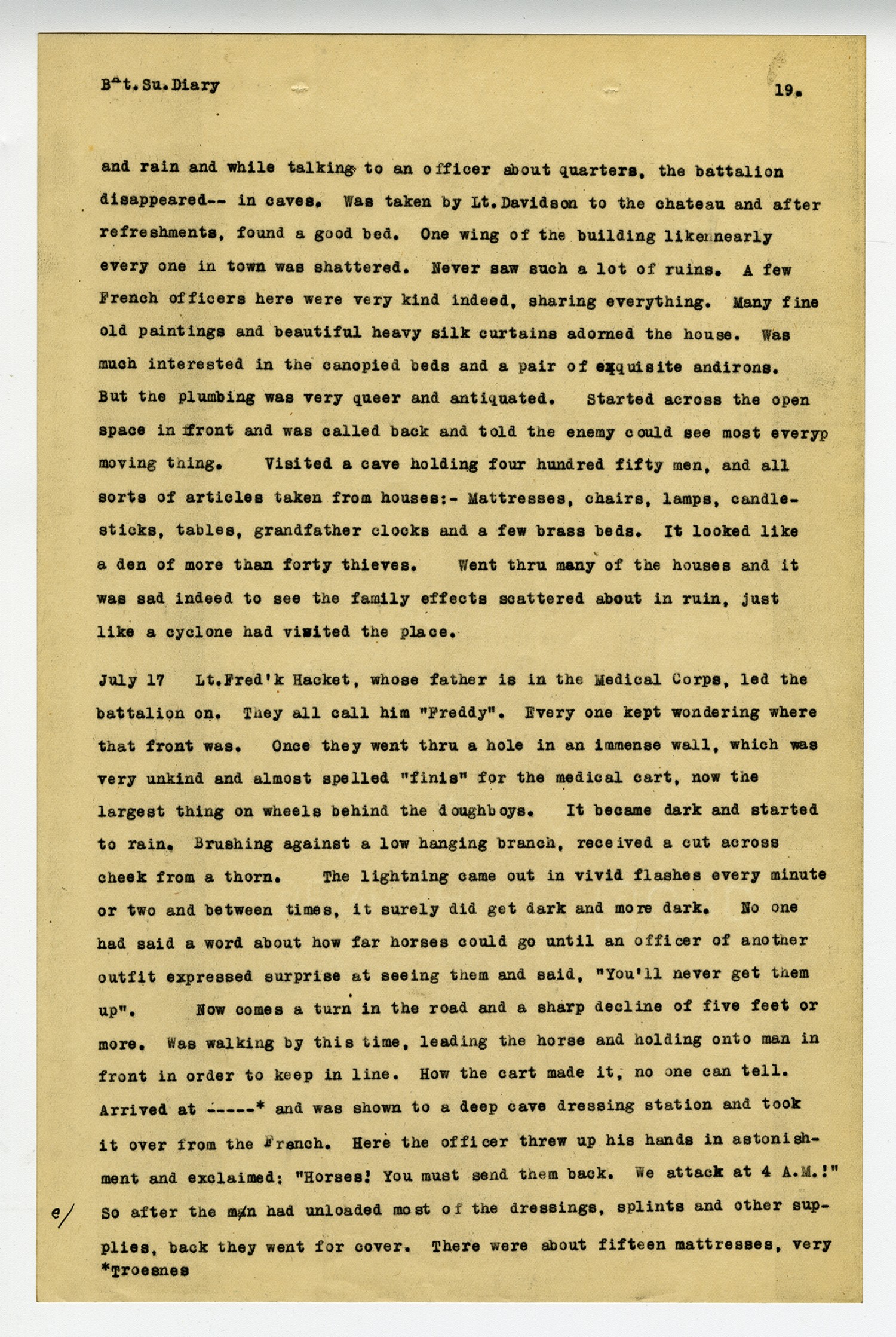 [page 19] Bat. Su. Diary and rain and while talking to an officer about quarters, the battalion disappeared--in caves. Was taken by Lt. Davidson to the chateau and after refreshments, found a good bed. One wing of the building like nearly every one in town was shattered. Never saw such a lot of ruins. A few French officers here were very kind indeed, sharing everything. Many fine old paintings and beautiful heavy silk curtains adorned the house. Was much interested in the canopied beds and a pair of exquisite andirons. But the plumbing was very queer and antiquated. Started across the open space in front and was called back and told the enemy could see most every moving thing. Visited a cave holding four hundred fifty men, and all sots of articles taken from houses:-Mattresses, chairs, lamps, candlesticks, tables, grandfather clocks and a few brass beds. It looked like a den of more than forty thieves. Went thru many of the houses and it was sad indeed to see the family effects scattered about in ruin, just like a cyclone had visited the place. July 17 Lt. Fred