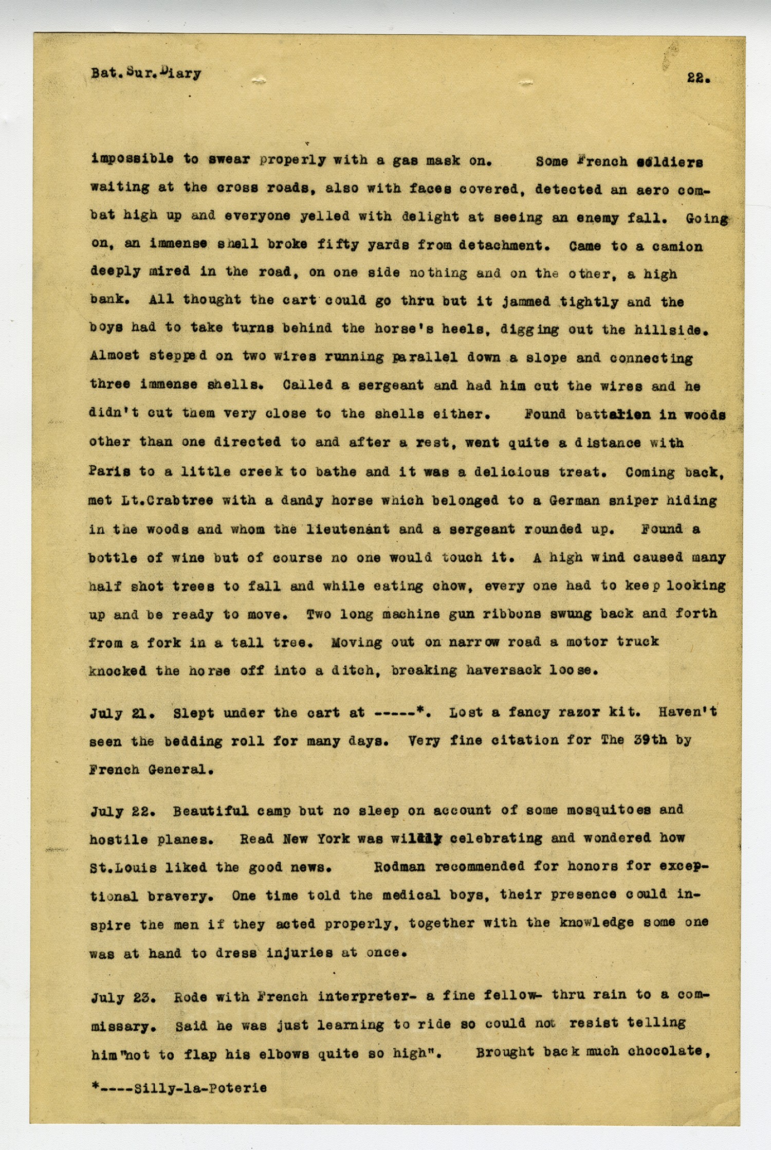[page 22] Bat. Sur. Diary impossible to swear properly with a gas mask on. Some French soldiers waiting at the cross roads, also with faces covered, detected an aero combat high up and everyone yelled with delight at seeing an enemy fall. Going on, an immense shell broke fifty yards from detachment. Came to a camion deeply mired in the road, on one side nothing and on the other, a high bank. All thought the cart could go thru but it jammed tightly and the boys and to take turns behind the horse