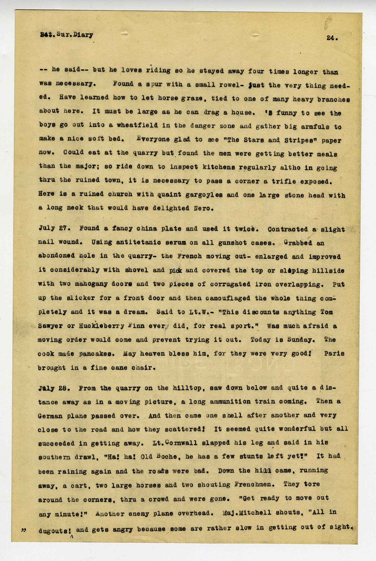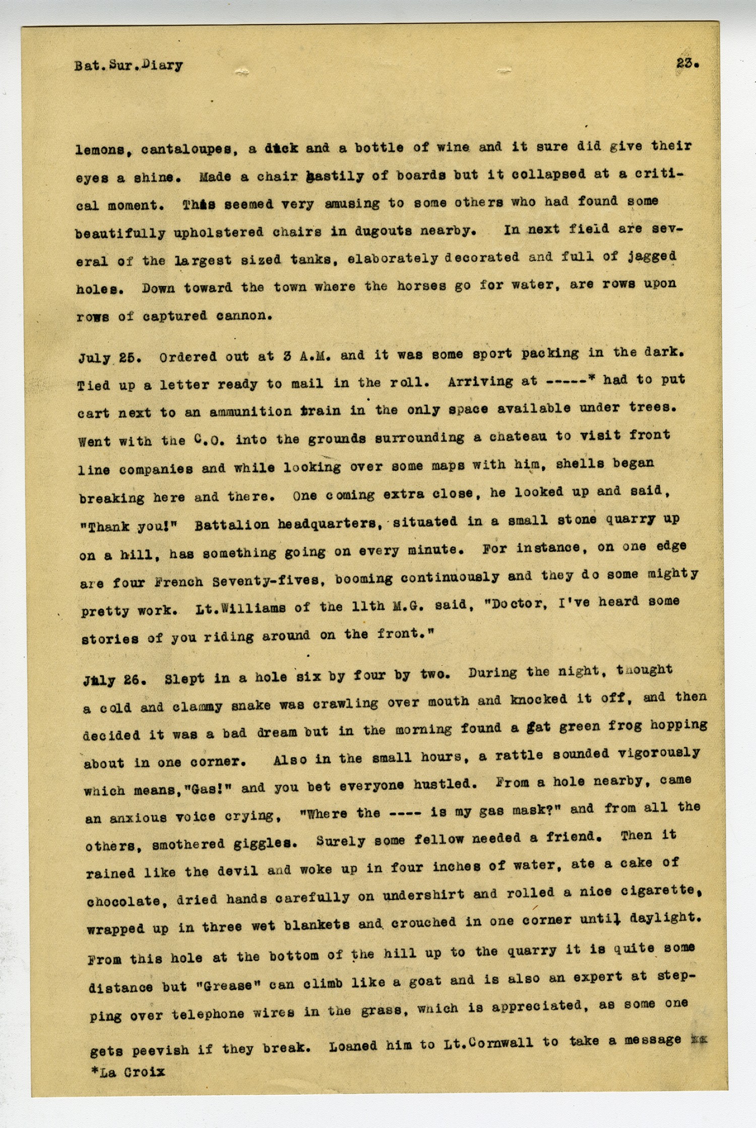 [page 23] Bat. Sur. Diary lemons, cantaloupes, a duck and a bottle of wine and it sure did give their eyes a shine. Made a chair hastily of boards but it collapsed at a critical moment. This seemed very amusing to some others who had found some beautifully upholstered chairs in dugouts nearby. In next field are several of the largest sized tanks, elaborately decorated and full of jagged holes. Down toward the town where the horses go for water, are rows upon rows of captured cannon. July 25. Ordered out at 3 A.M. and it was some sport packing in the dark. Tied up a letter ready to mail in the roll. Arriving at ---* had to put cart next to an ammunition train in the only space available under trees. Went with the C.O. into the grounds surrounding a chateau to visit front line companies and while looking over some maps with him, shells began breaking here and there. One coming extra close, he looked up and said,