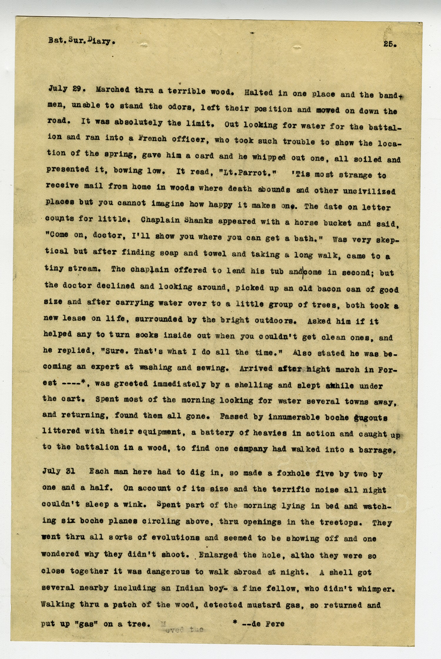 [page 25] Bat. Sur. Diary. July 29. Marched thru a terrible wood. Halted in one place and the band men, unable to stand the odors, left their position and moved on down the road. It was absolutely the limit. Out looking for water for the battalion and ran into a French officer, who took such trouble to show the location of the spring, gave him a card and he whipped out one, all soiled and presented it, bowing low. It read,