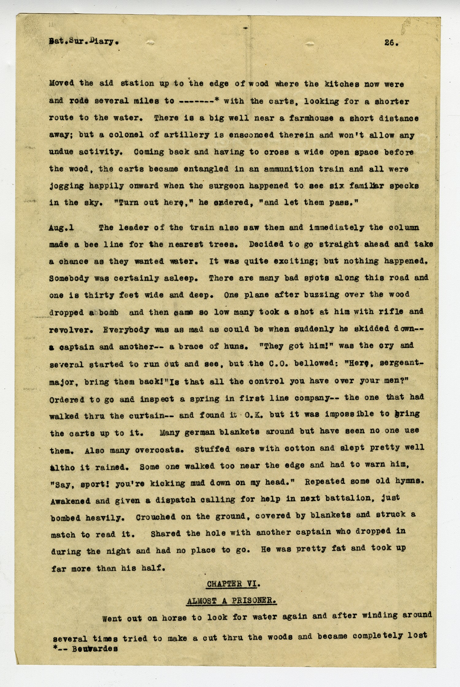 [page 26] Bat. Sur. Diary. Moved the aid station up to the edge of wood where the kitches now were and rode several miles to ----* with the carts, looking for a shorter route to the water. There is a big well near a farmhouse a short distance away; but a colonel of artillery is ensconced therein and won