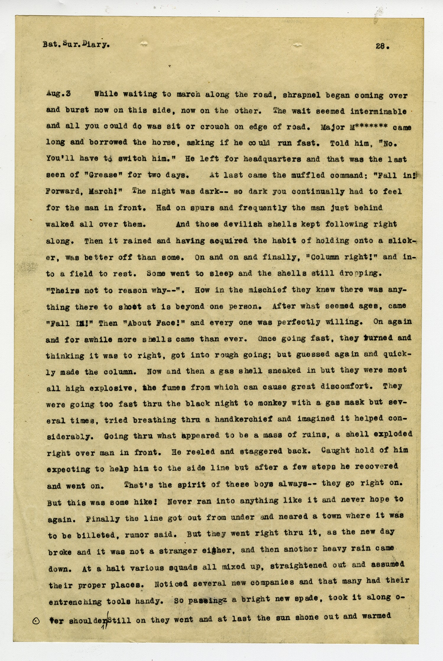 [page 28] Bat. Sur. Diary. [August] 3 While waiting to march along the road, shrapnel began coming over and burst now on this side, now on the other. The wait seemed interminable and all you could do was sit or crouch on edge of road. Major M**** came long and borrowed the horse, asking if he could run fast. Told him,