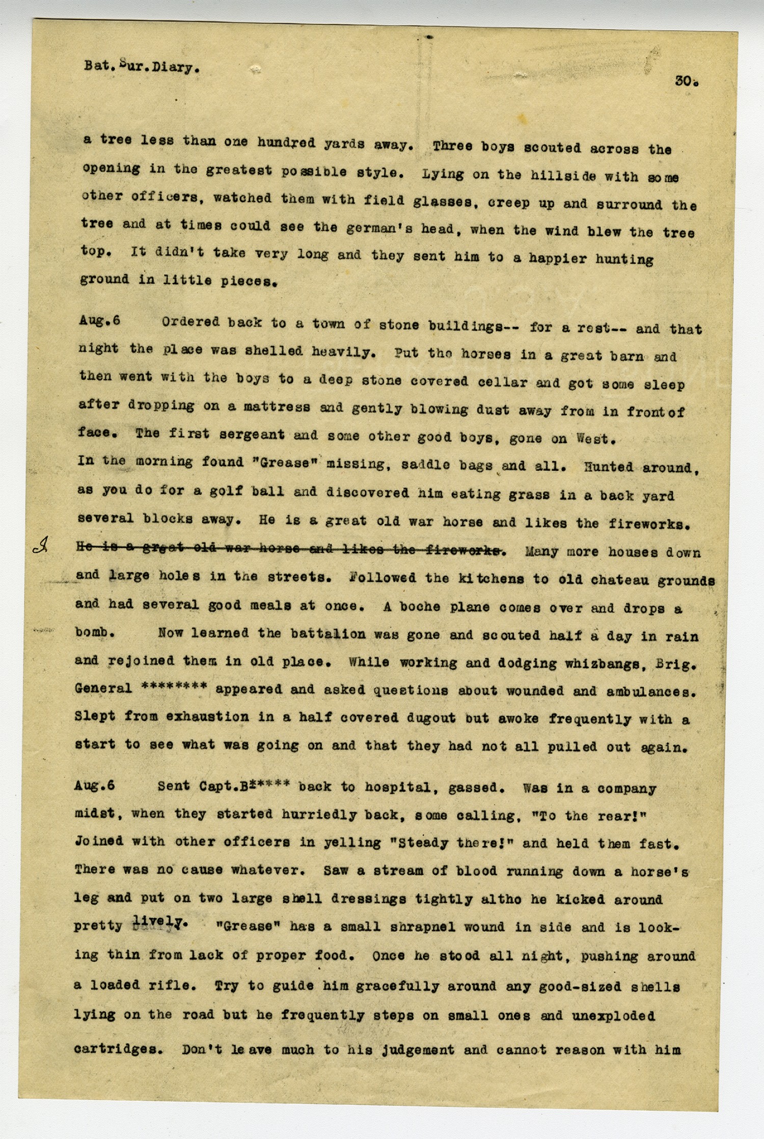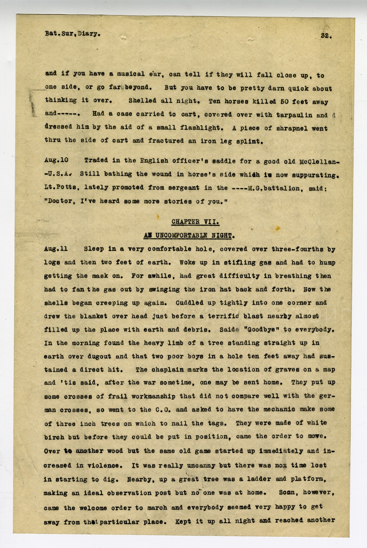 [page 32] Bat. Sur, Diary. and if you have a musical ear, can tell if they will fall close up, to one side, or go far beyond. But you have to be pretty darn quick about thinking it over. Shelled all night. Ten horses killed 50 feet away and---. Had a case carried to cart, covered over with tarpaulin and dressed him by the aid of a small flashlight. A piece of shrapnel went thru the side of cart and fractured an iron leg splint. [August] 10 Traded in the English officer
