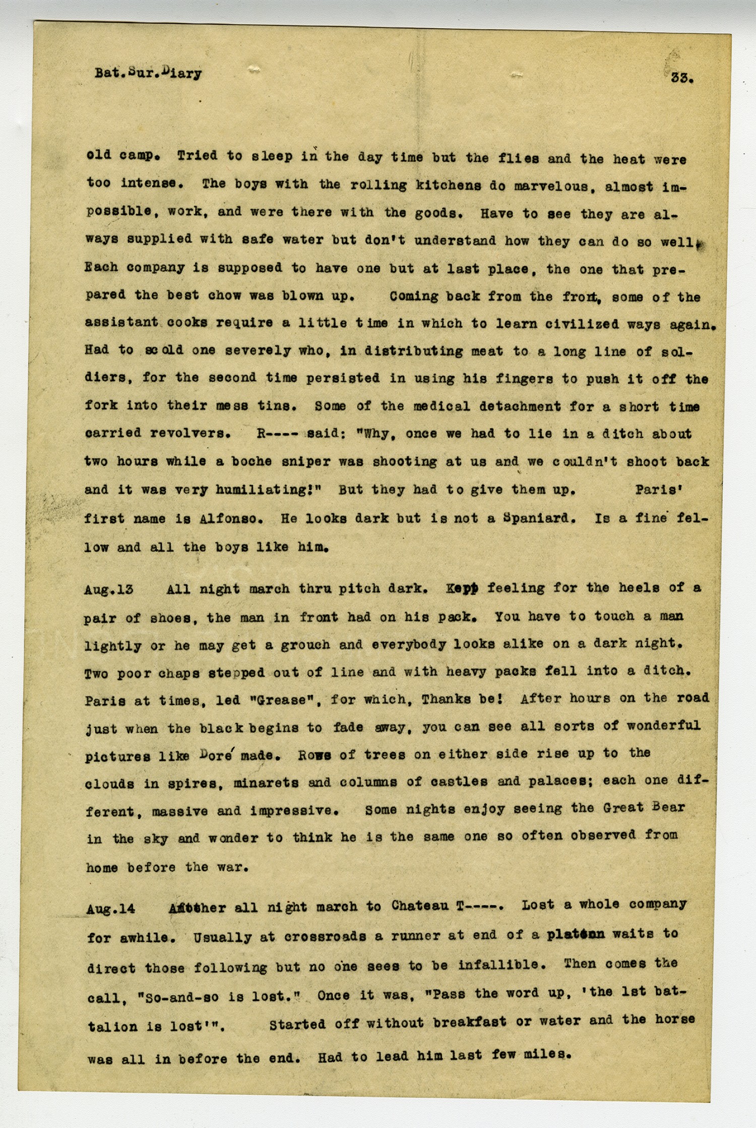 [page 33] Bat. Sur. Diary old camp. Tried to sleep in the day time but the flies and the heat were too intense. The boys with the rolling kitchens do marvelous, almost impossible, work, and were there with the goods. Have to see they are always supplied with safe water but don