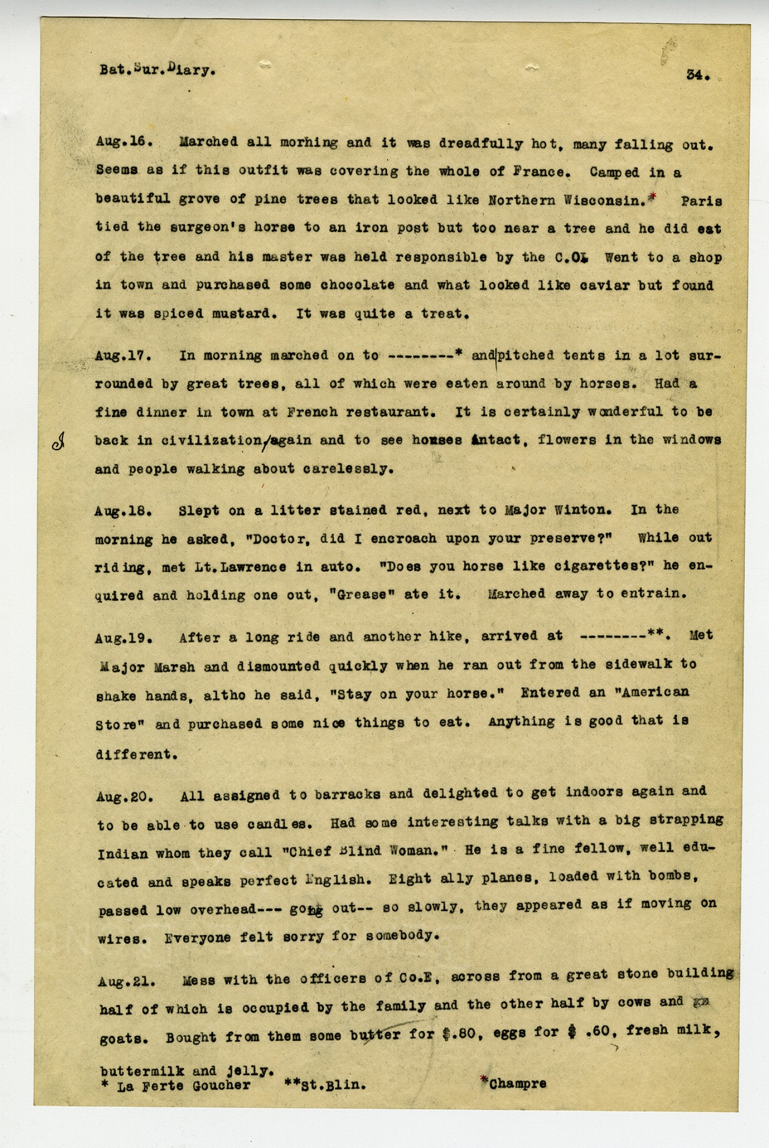 [page 34] Bat. Sur. Diary. [August] 16. Marched all morning and it was dreadfully hot, many falling out. Seems as if this outfit was covering the whole of France. Camped in a beautiful grove of pine trees that looked like Northern Wisconsin.* Paris tied the surgeon