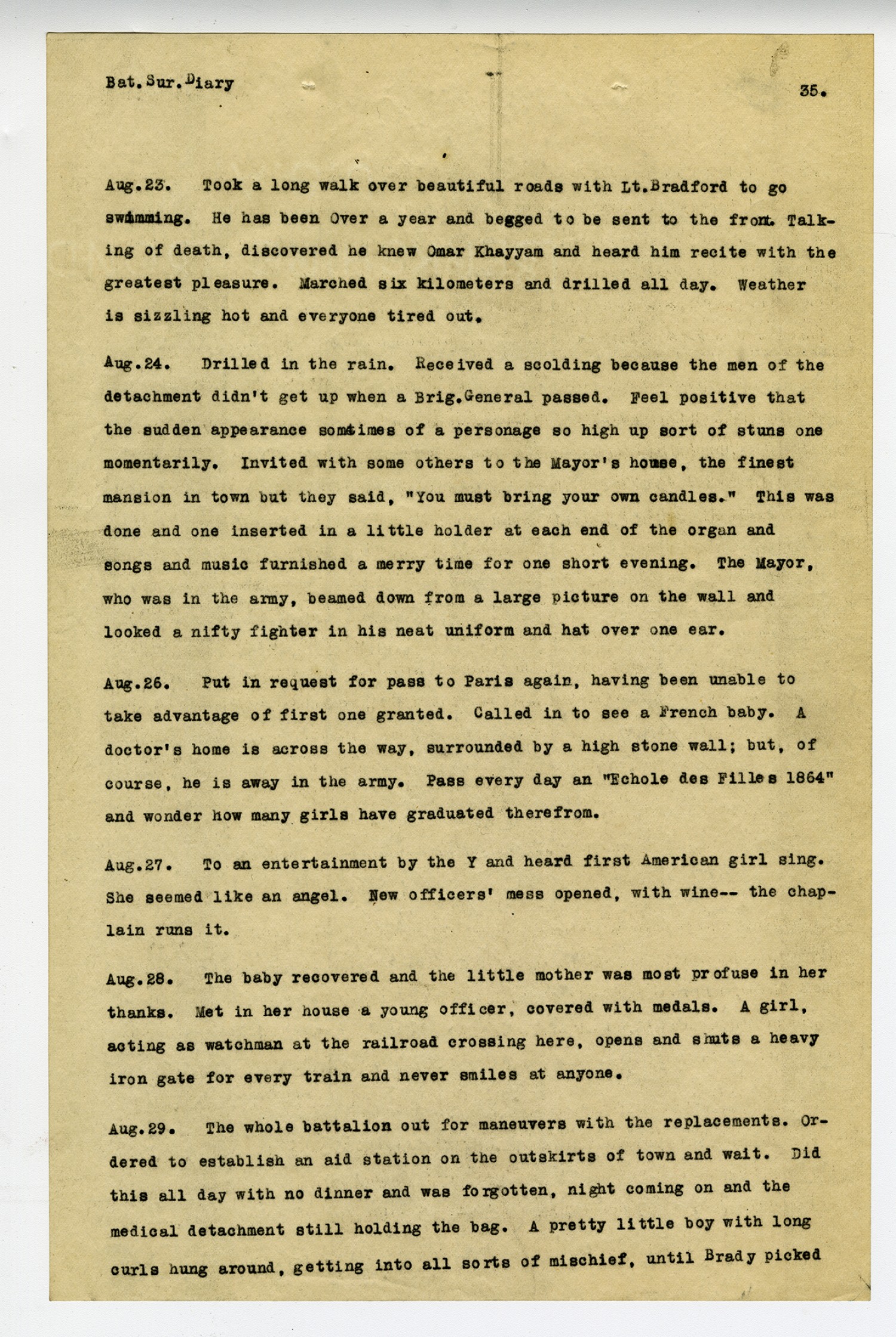 [page 35] Bat. Sur. Diary [August] 23 Took a long walk over beautiful roads with Lt. Bradford to go swimming. He has been Over a year and begged to be sent to the front. Talking of death, discovered he knew Omar Khayyam and heard him recite with the greatest pleasure. Marched six kilometers and drilled all day. Weather is sizzling hot and everyone tired out. [August] 24. Drilled in the rain. Received a scolding because the men of the detachment didn