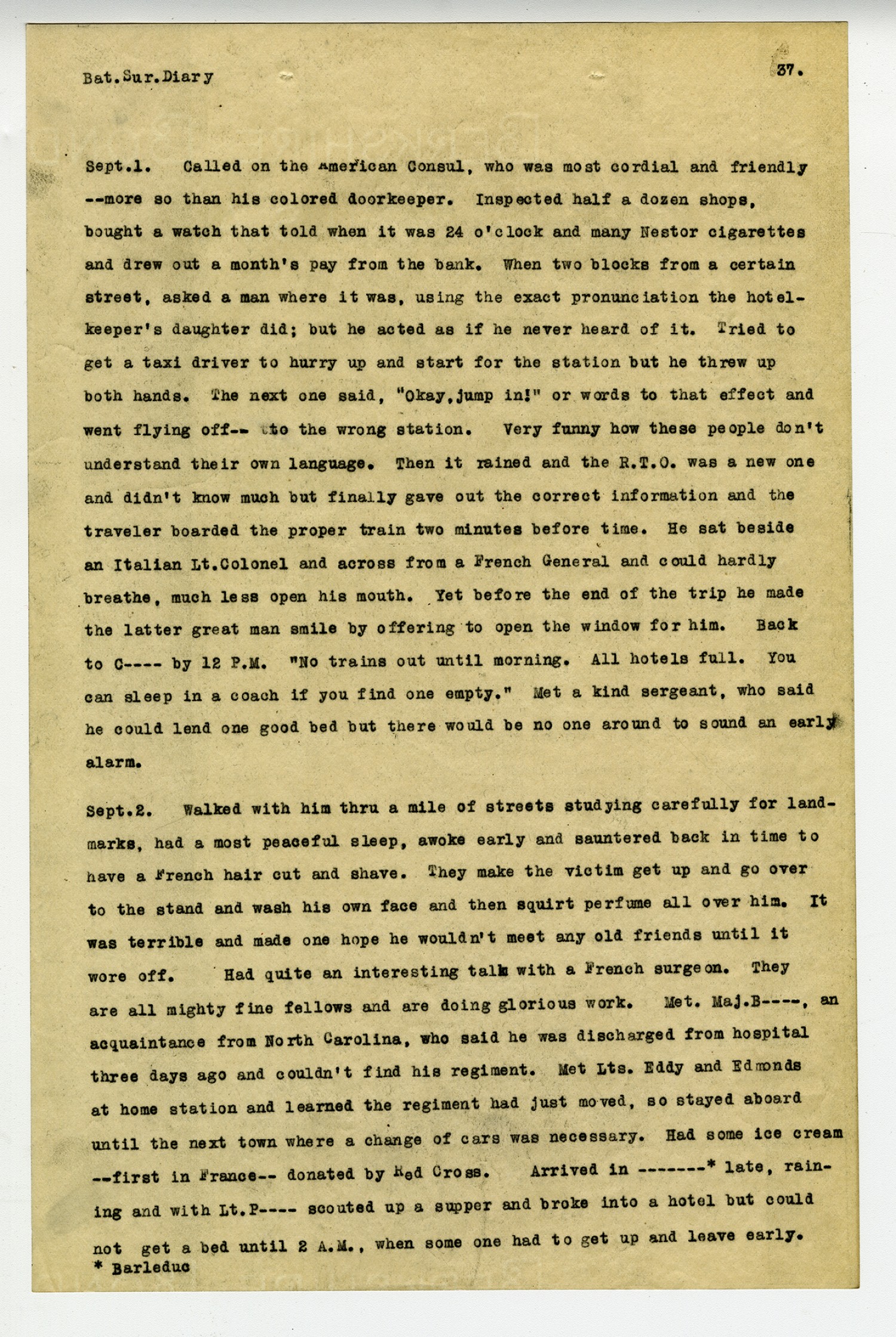 [page 37] Bat. Sur. Diary. [September] 1. Called on the American Consul, who was most cordial and friendly--more so than his colored doorkeeper. Inspected half a dozen shops, bought a watch that told when it was 24 o