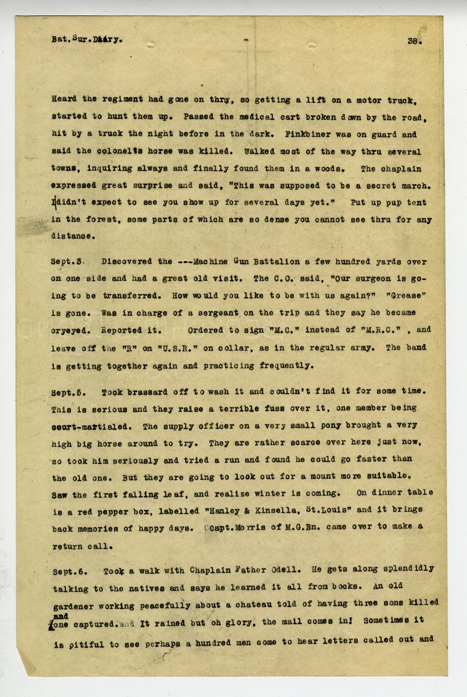 [page 38] Bat. Sur. Diary. Heard the regiment had gone on thru, so getting a lift on a motor truck, started to hunt them up. Passed the medical cart broken down by the road, hit by a truck the night before in the dark. Finkbiner was on guard and said the colonels horse was killed. Walked most of the way thru several towns, inquiring always and finally found them in a woods. The chaplain expressed great surprise and said,