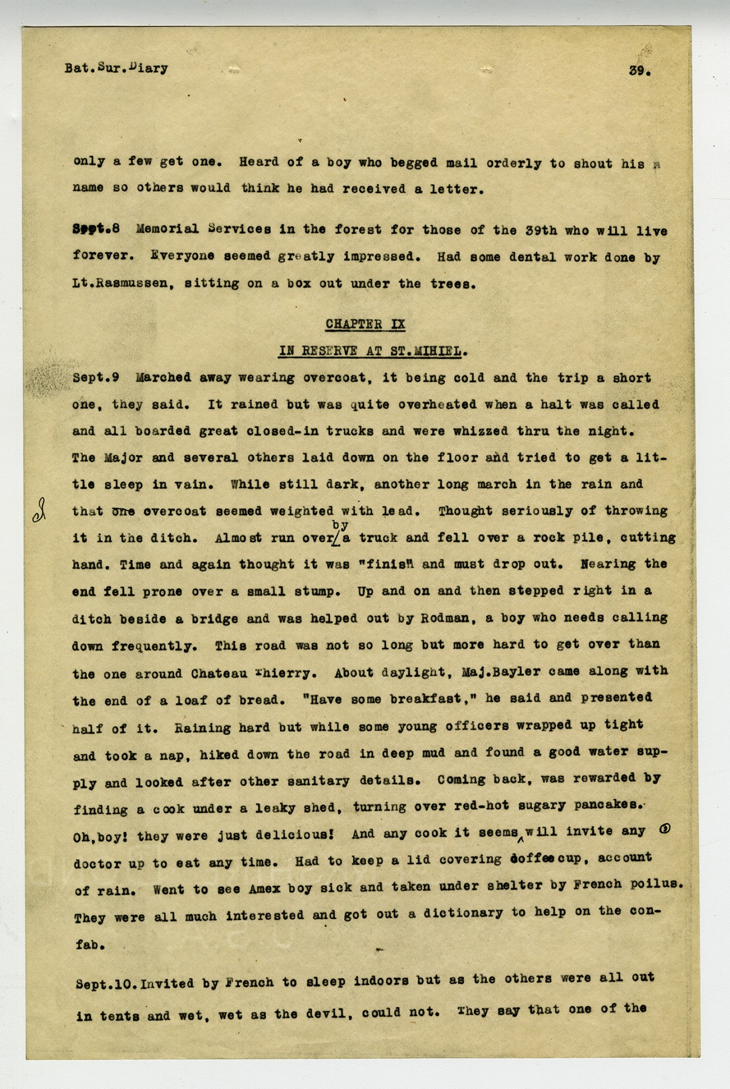 [page 39] Bat. Sur. Diary only a few get one. Heard of a boy who begged mail orderly to shout his name so others would think he had received a letter. [September] 8. Memorial Services in the forest for those of the 39th who will live forever. Everyone seemed greatly impressed. Had some dental work done by Lt. Rasmussen, sitting on a box out under the trees. Chapter IX In Reserve at St. Mihiel. [September] 9 Marched away wearing overcoat, it being cold and the trip a short one, they said. It rained but was quite overheated when a halt was called and all boarded great closed-in trucks and were whizzed thru the night. The Major and several others laid down on the floor and tried to get a little sleep in vain. While still dark, another long march in the rain and that one overcoat seemed weighted with lead. Thought seriously of throwing it in the ditch. Almost run over by a truck and fell over a rock pile, cutting hand. Time and again thought it was