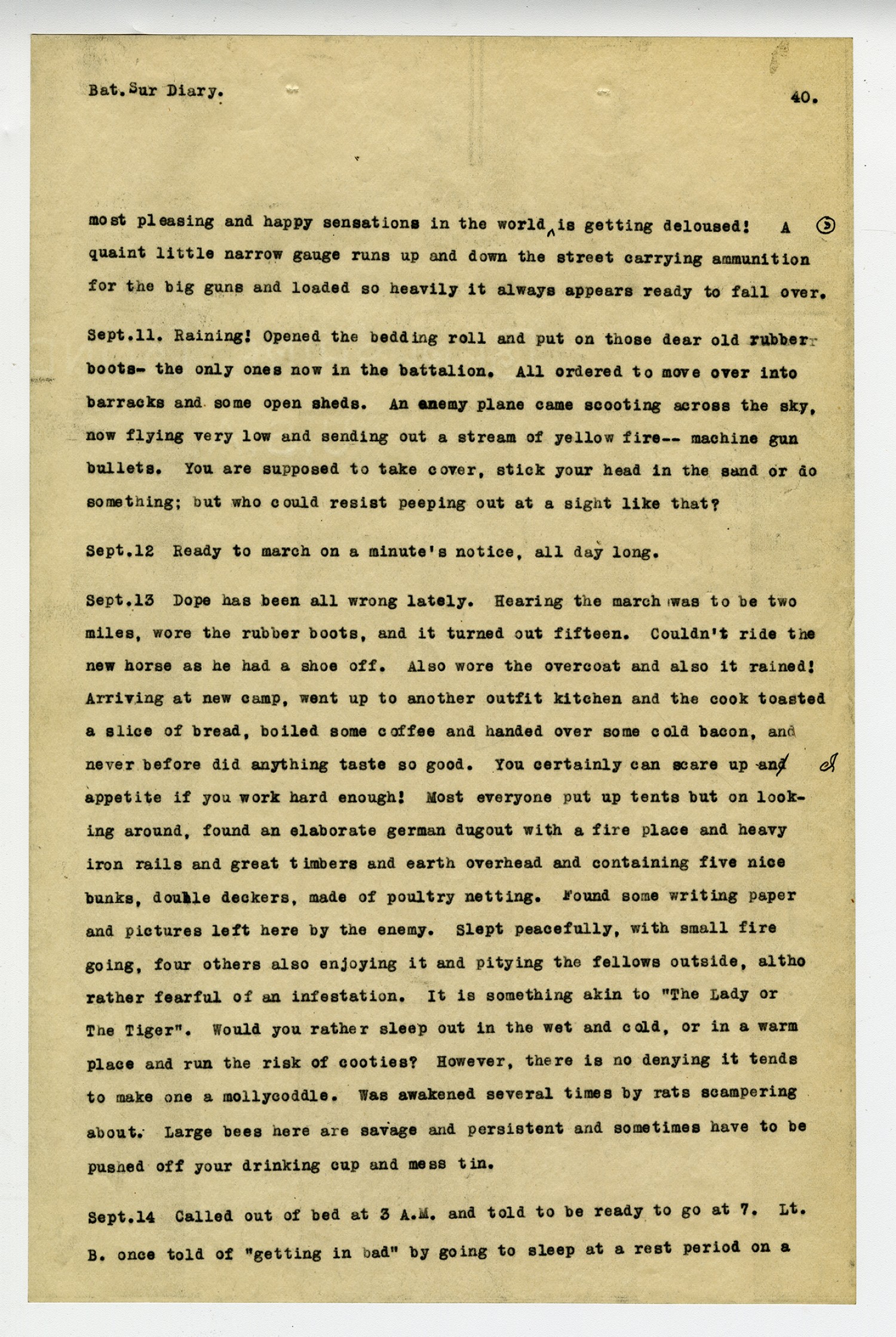 [page 40] Bat. Sur. Diary. most pleasing and happy sensations in the world is getting deloused! A quaint little narrow gauge runs up and down the street carrying ammunition for the big guns and loaded so heavily it always appears ready to fall over. [September] 11. Raining! Opened the bedding roll and put on those dear old rubber boots- the only ones not in the battalion. All ordered to move over into barracks and some open sheds. An enemy plane came scooting across the sky, now flying very low and sending out a stream of yellow fire--machine gun bullets. You are supposed to take cover, stick your head in the sand or do something; but who could resist peeping out at a sight like that? [September] 12 Ready to march on a minute