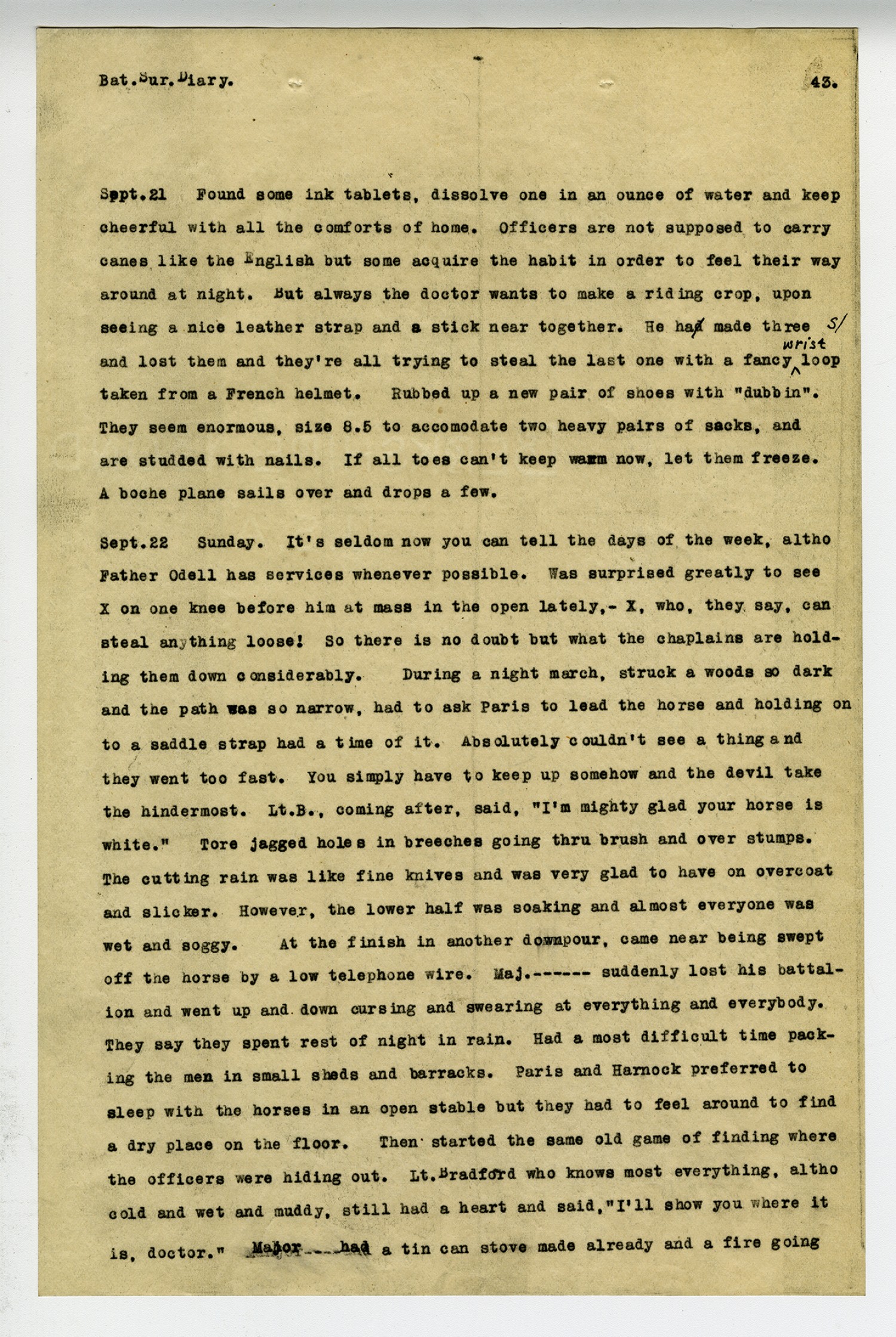 [page 43] Bat. Sur. Diary. [September] 21 Found some ink tablets, dissolve one in an ounce of water and keep cheerful with all the comforts of home. Officers are not supposed to carry canes like the English but some acquire the habit in order to feel their way around at night. But always the doctor wants to make a riding crop, upon seeing a nice leather strap and a stick near together. He had made three and lost them and they