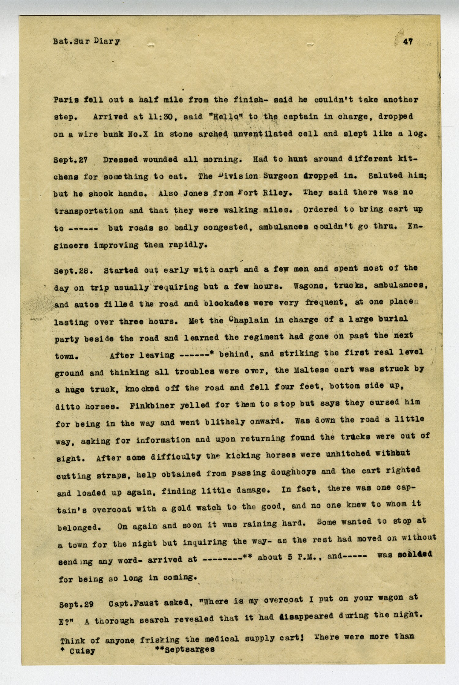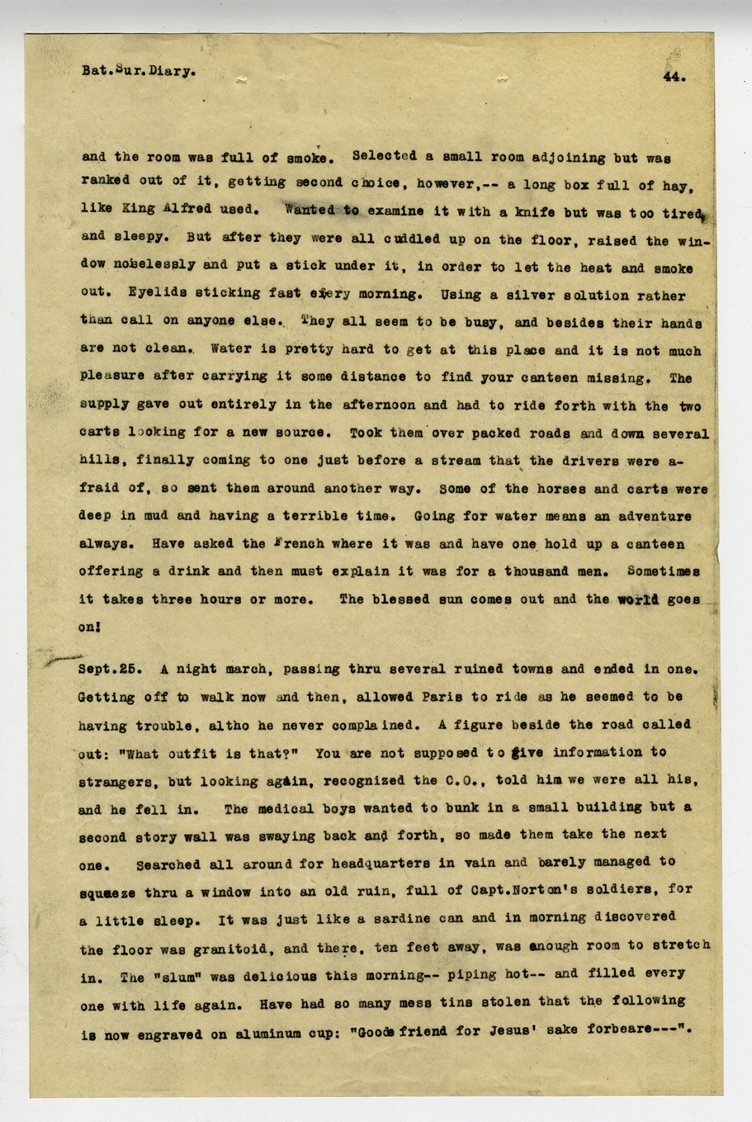 [page 44] Bat. Sur. Diary. and the room was full of smoke. Selected a small room adjoining but was ranked out of it, getting second choice, however, --a long box full of hay, like King Alfred used. Wanted to examine it with a knife but was too tired and sleepy. But after they were all cuddled up on the floor, raised the window noiselessly and put a stick under it, in order to let the heat and smoke out. Eyelids sticking fast every morning. Using a silver solution rather than call on anyone else. They all seem to be busy, and besides their hands are not clean. Water is pretty hard to get at this place and it is not much pleasure after carrying it some distance to find your canteen missing. the supply gave out entirely in the afternoon and had to ride forth with the two carts looking for a new source. Took them over packed roads and down several hills, finally coming to one just before a stream that the drivers were afraid of, so sent them around another way. Some of the horses and carts were deep in mud and having a terrible time. Going for water means an adventure always. Have asked the French where it was and have one hold up a canteen offering a drink and then must explain it was for a thousand men. Sometimes it takes three hours or more. The blessed sun comes out and the world goes on! [September] 25. A night march, passing thru several ruined towns and ended in one. Getting off to walk now and then, allowed Paris to ride as he seemed to be having trouble, altho he never complained. A figure beside the road called out: