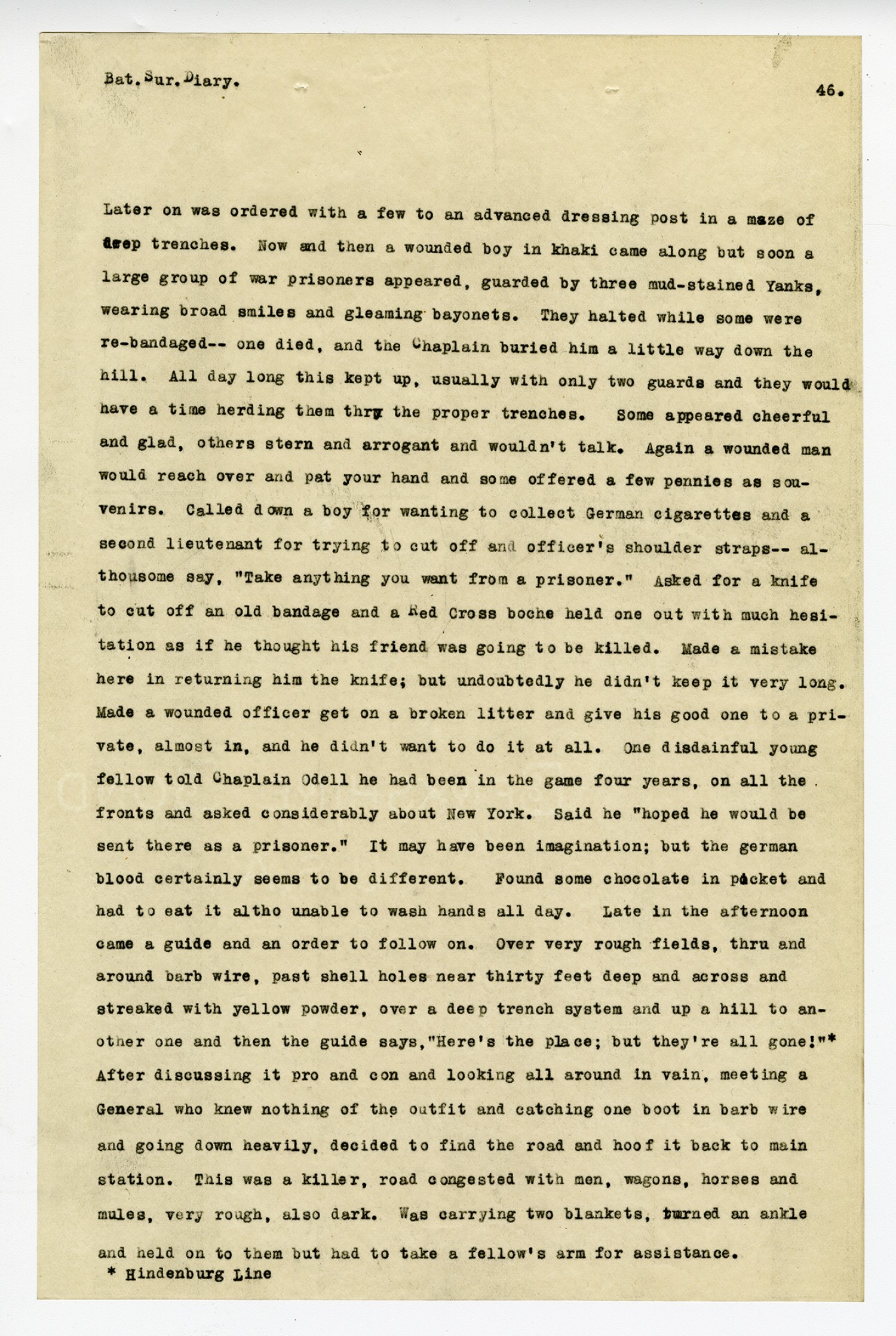 [page 46] Bat. Sur. Diary. Later on was ordered with a few to an advanced dressing post in a maze of deep trenches. Now and then a wounded boy in khaki came along but soon a large group of war prisoners appeared, guarded by three mud-stained Yanks, wearing broad smiles and gleaming bayonets. They halted while some were re-bandaged--one died, and the Chaplain buried him a little way down the hill. All day long this kept up, usually with only two guards and they would have a time herding them thru the proper trenches. Some appeared cheerful and glad, others stern and arrogant and wouldn