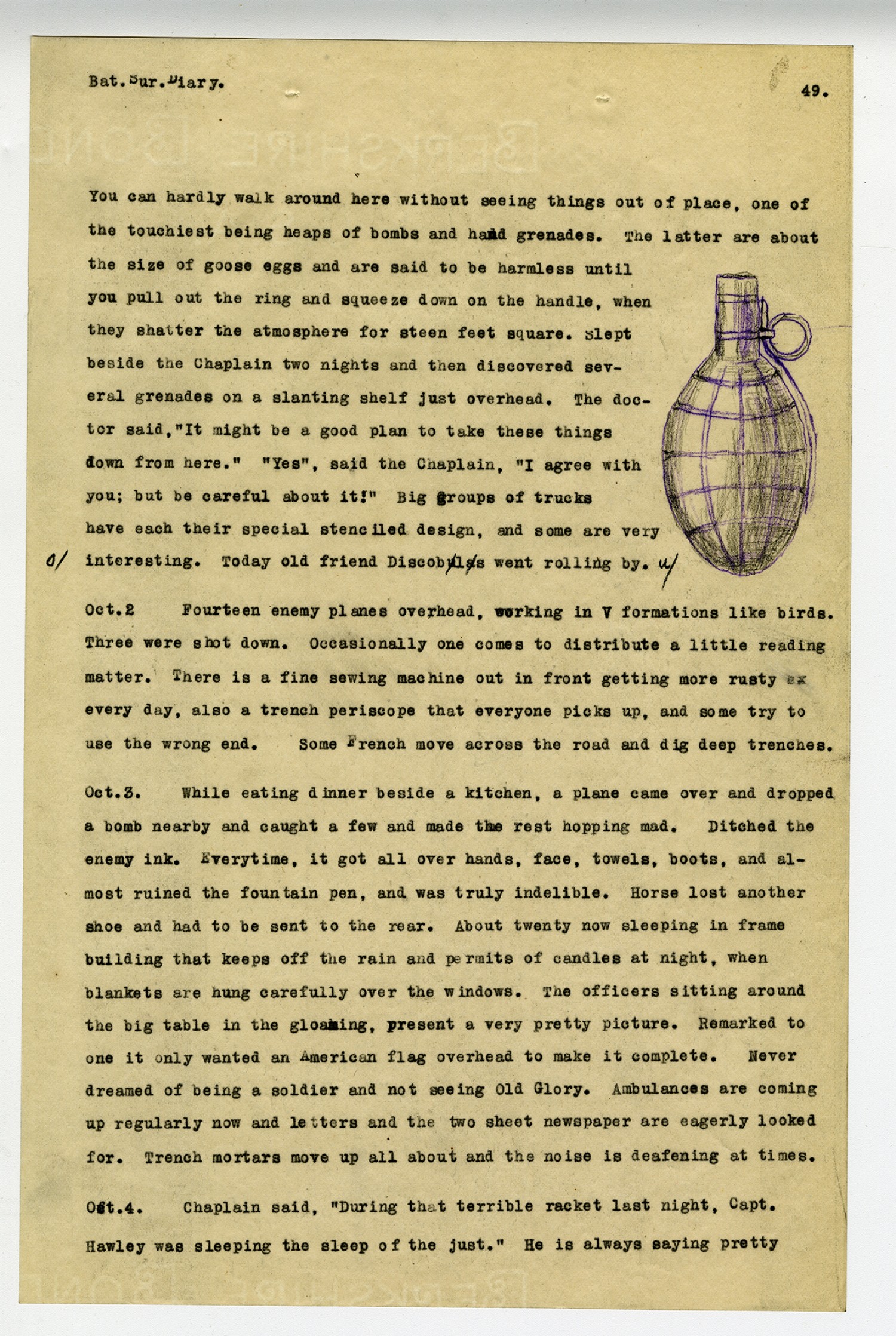 [page 49] Bat. Sur. Diary. You can hardly walk around here without seeing things out of place, one of the touchiest being heaps of bombs and hand grenades. The latter are about the size of goose eggs and are said to be harmless until you pull out the ring and squeeze down on the handle, when they shatter the atmosphere for steen feet square. Slept beside the Chaplain two nights and then discovered several grenades on a slanting shelf just overhead. The doctor said,