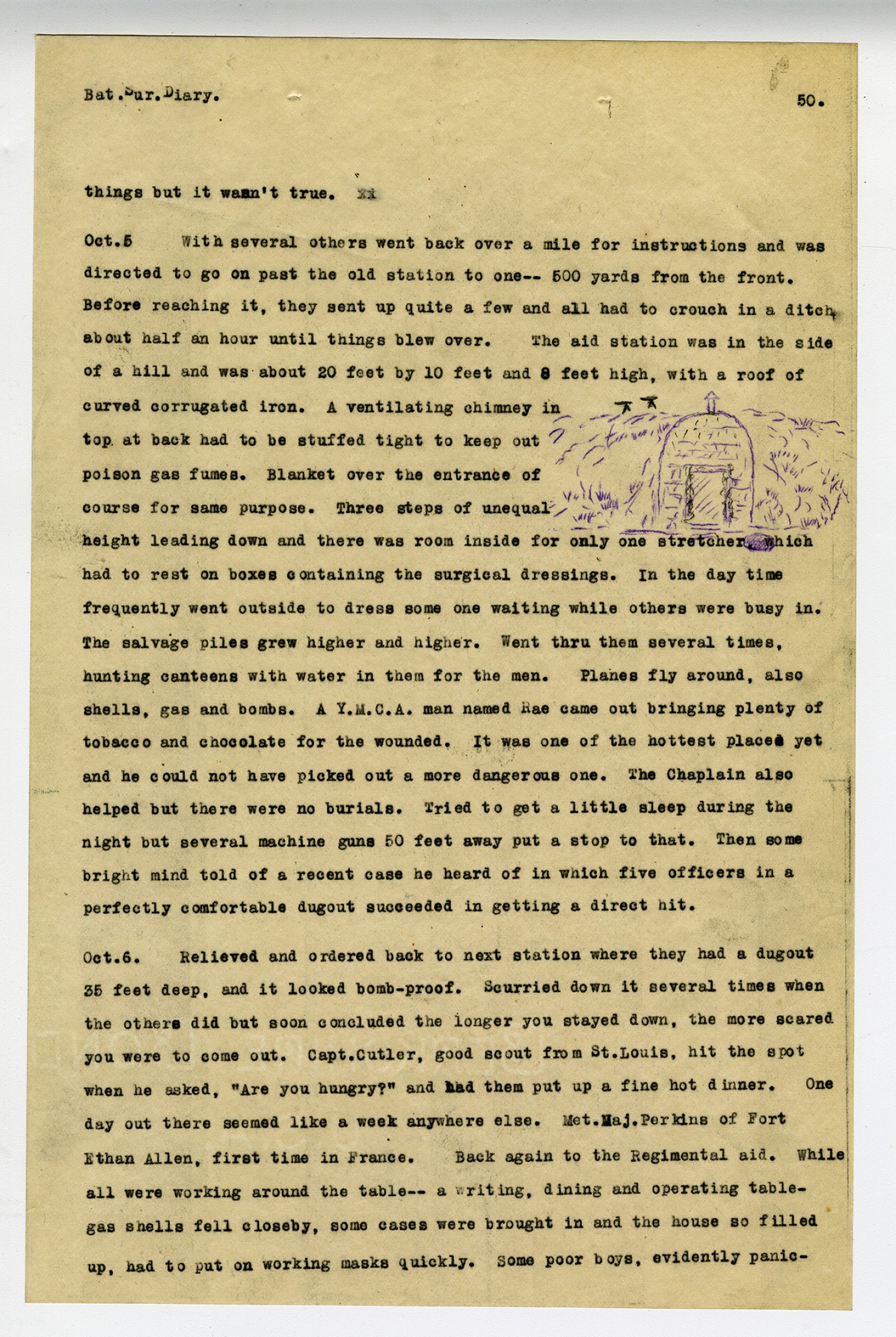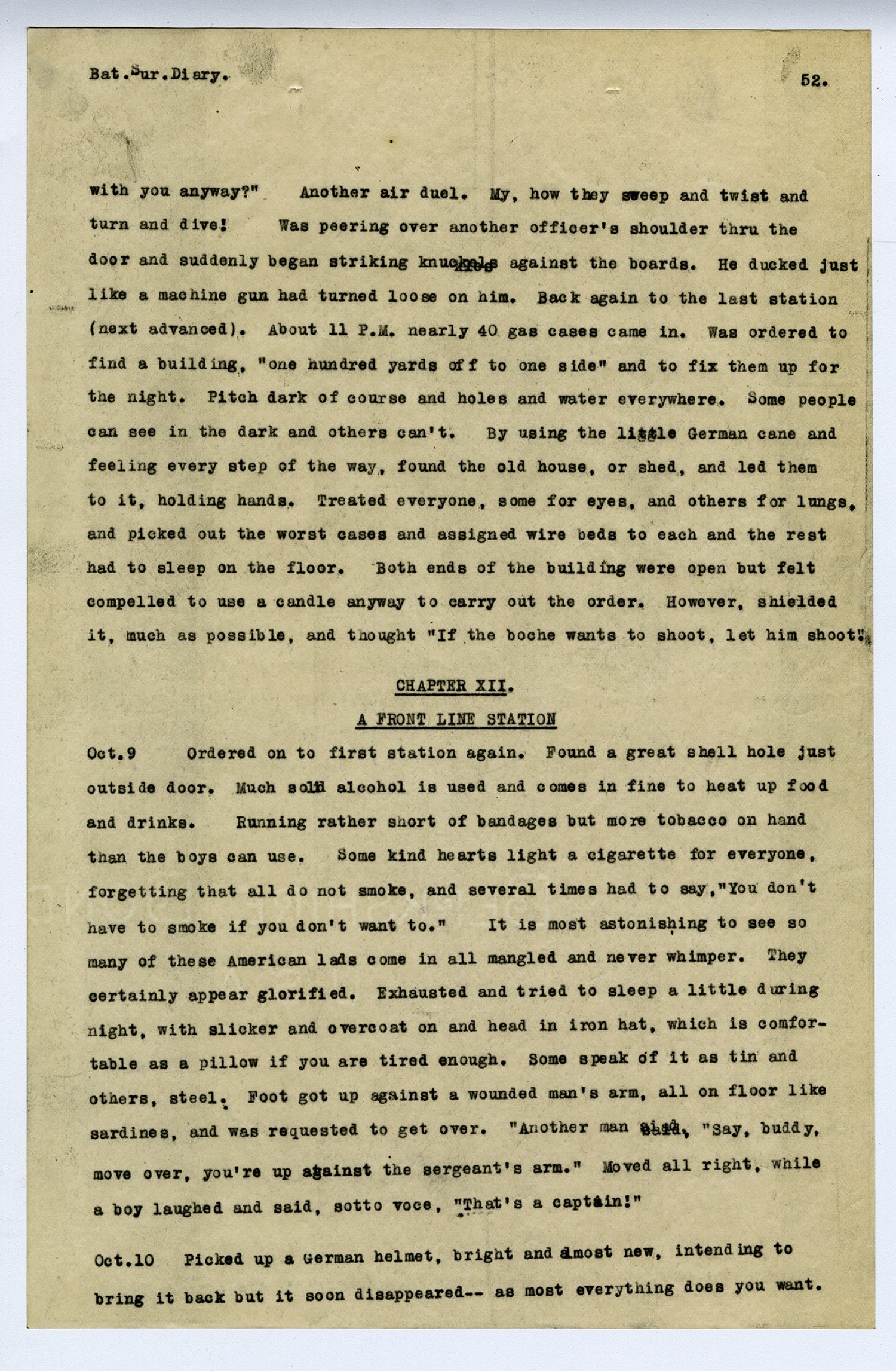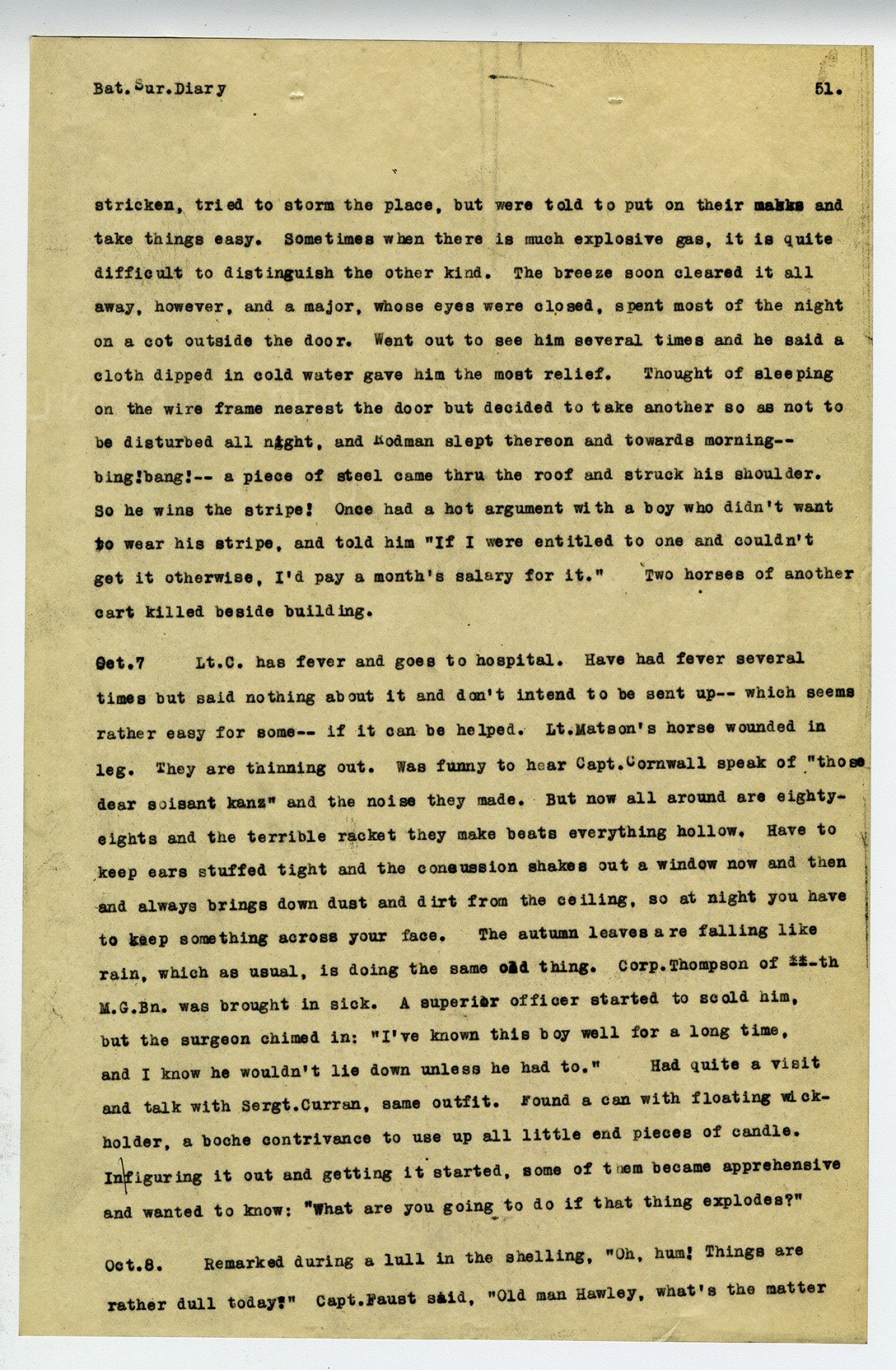 [page 51] Bat. Sur. Diary stricken, tried to storm the place, but were told to put on their masks and take things easy. Sometimes when there is much explosive gas, it is quite difficult to distinguish the other kind. The breeze soon cleared it all away, however, and a major, whose eyes were closed, spent most of the night on a cot outside the door. Went out to see him several times and he said a cloth dipped in cold water gave him the most relief. Thought of sleeping on the wire frame nearest the door but decided to take another so as not to be disturbed all night, and Rodman slept thereon and towards morning-- bing! bang!-- a piece of steel came thru the roof and struck his shoulder. So he wins the stripe! Once had a hot argument with a boy who didn
