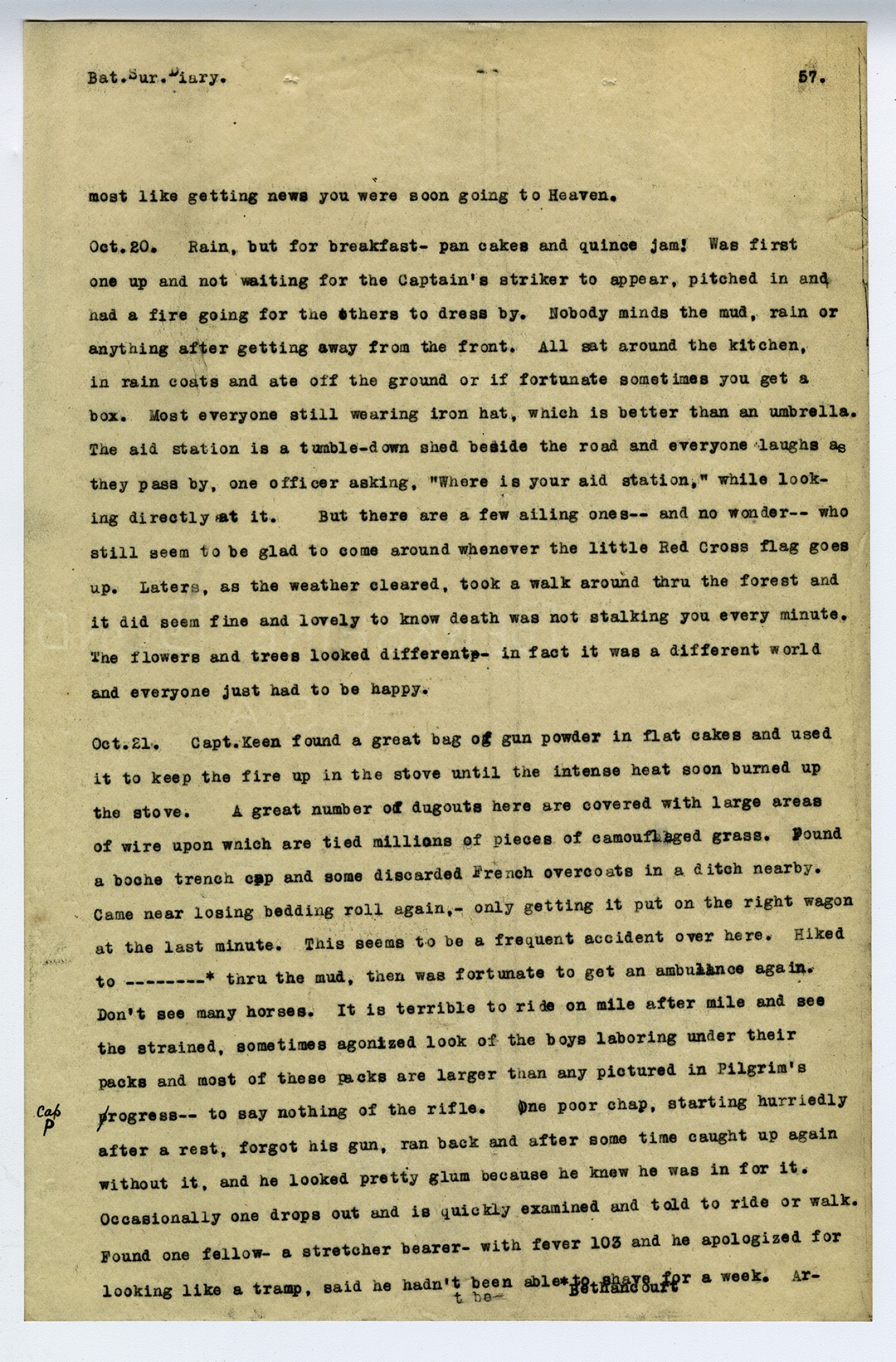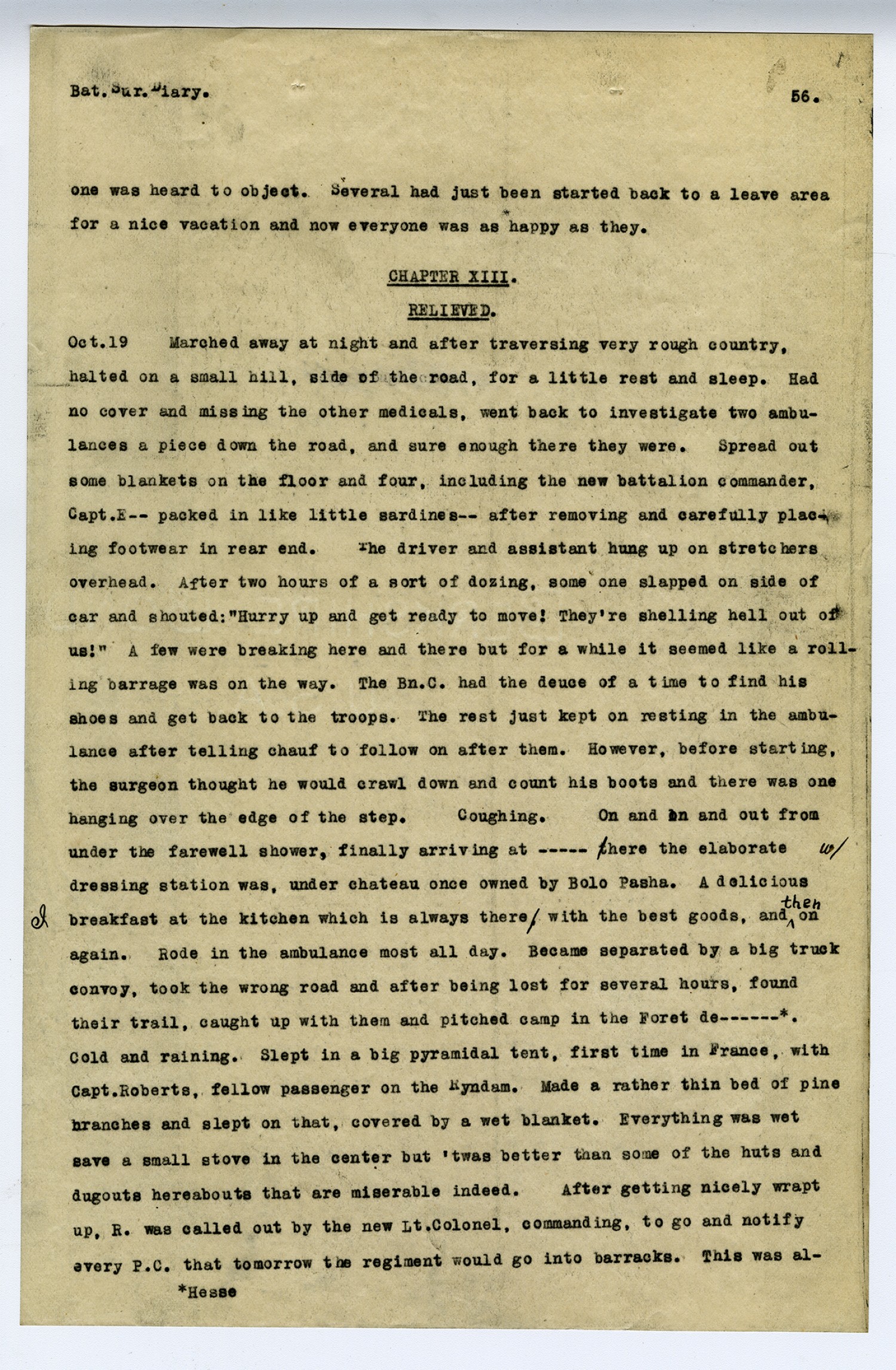 [page 56] Bat. Sur. Diary. one was heard to object. Several had just been started back to a leave area for a nice vacation and now everyone was as happy as they. Chapter XIII. Relieved. [October] 19. Marched away at night and after traversing very rough country, halted on a small hill, side of the road, for a little rest and sleep. Had no cover and missing the other medicals, went back to investigate two ambulances a piece down the road, and sure enough there they were. Spread out some blankets on the floor and flour, including the new battalion commander, Capt. E-- packed in like little sardines -- after removing and carefully placing footwear in rear end. The driver and assistant hung up on stretchers overhead. After two hours of a sort of doxing, some one slapped on side of car and shouted: