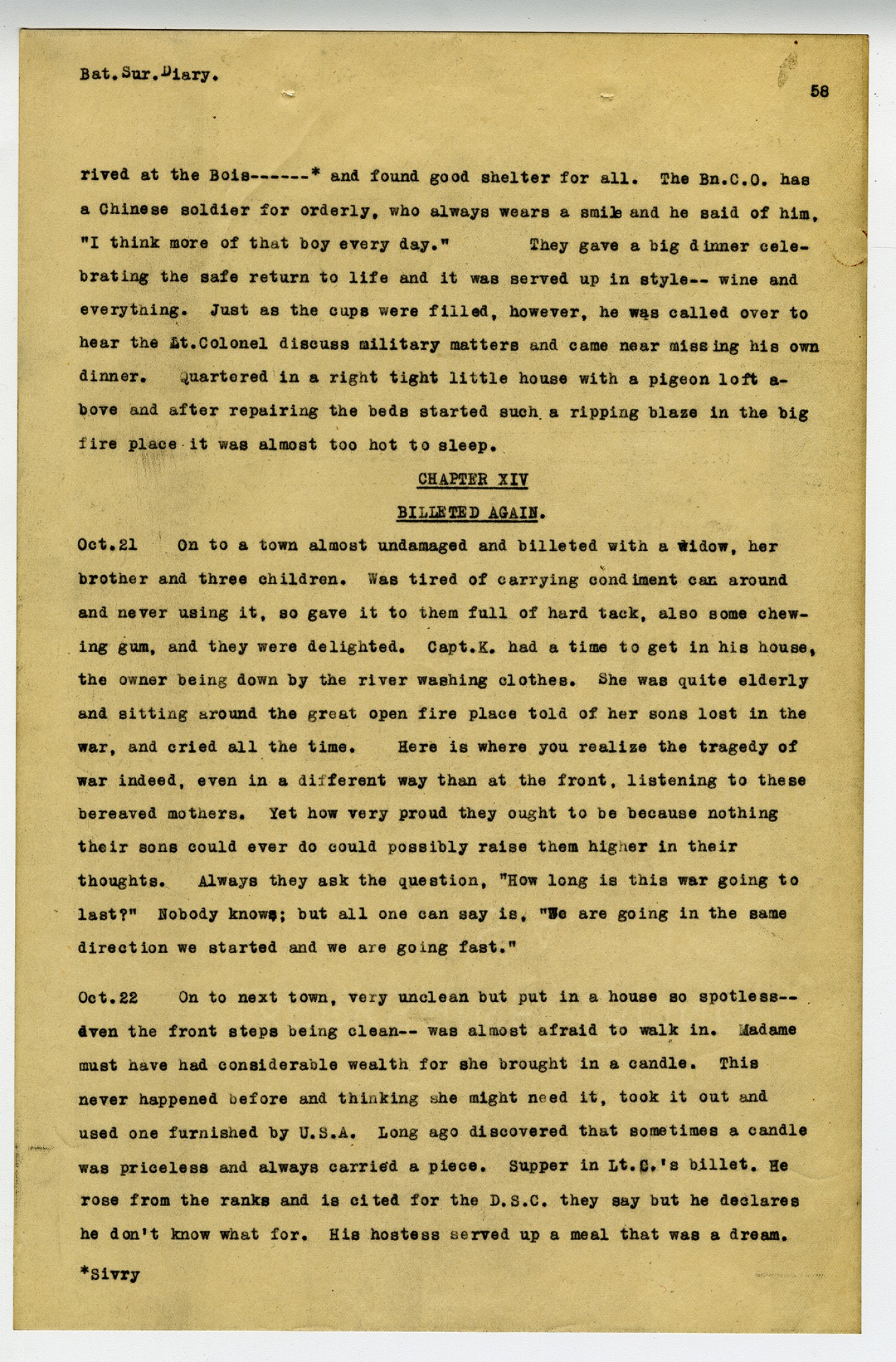[page 58] Bat. Sur. Diary. rived at the Bois ----* and found good shelter for all. The Bn.C.O. has a Chinese soldier for orderly, who always wears a smile and he said of him,