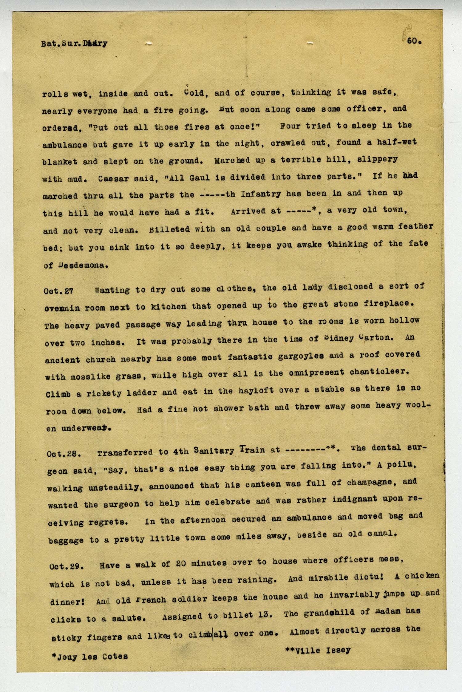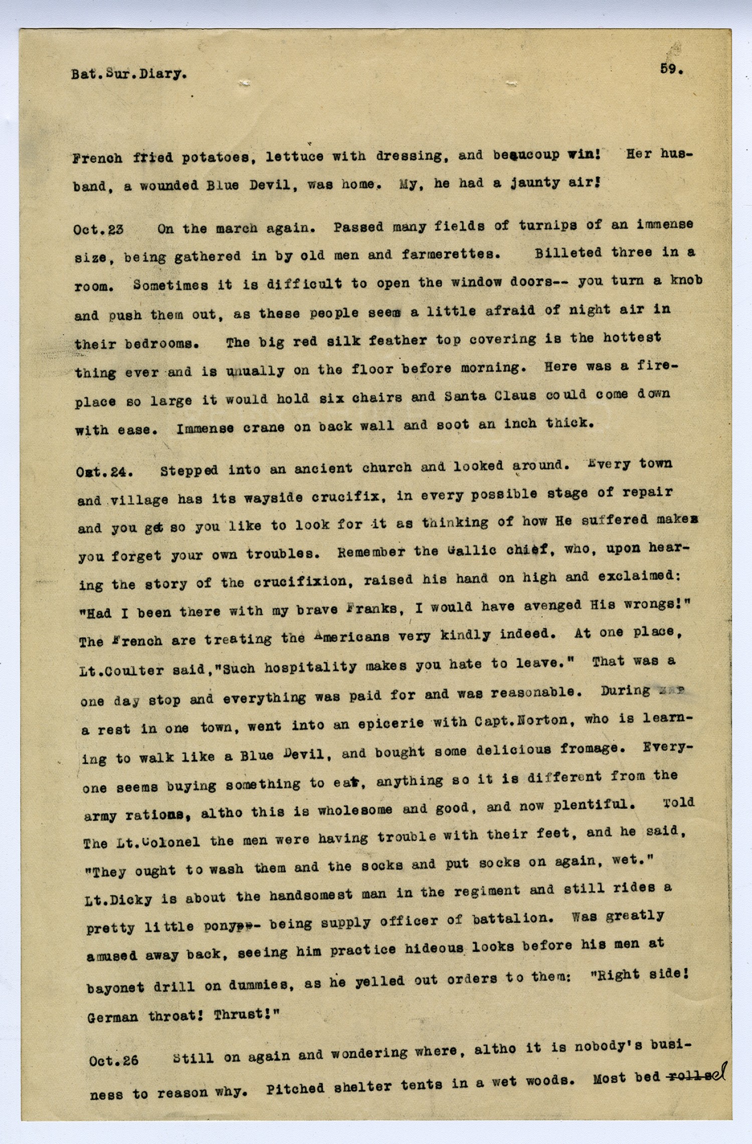 [page 59] Bat. Sur. Diary. French fried potatoes, lettuce with dressing, and beaucoup win! Her husband, a wounded Blue Devil, was home. My, he had a jaunty air! [October] 23 On the march again. Passed many fields of turnips of an immense size, being gathered in by old men and farmerettes. Billeted three in a room. Sometimes it is difficult to open the window doors-- you turn a knob and push them out, as these people seem a little afraid of night air in their bedrooms. The big red silk feather top covering is the hottest thing ever and is unually on the floor before morning. Here was a fireplace so large it would hold six chairs and Santa Claus could come down with ease. Immense crane on back wall and soot an inch think. [October] 24. Stepped into an ancient church and looked around. Every town and village has its wayside crucifix, in every possible stage of repair and you get so you like to look for it as thinking of how He suffered makes you forget your own troubles. Remember the Gallic chief, who, upon hearing the story of the crucifixion, raised his hand on high and exclaimed: