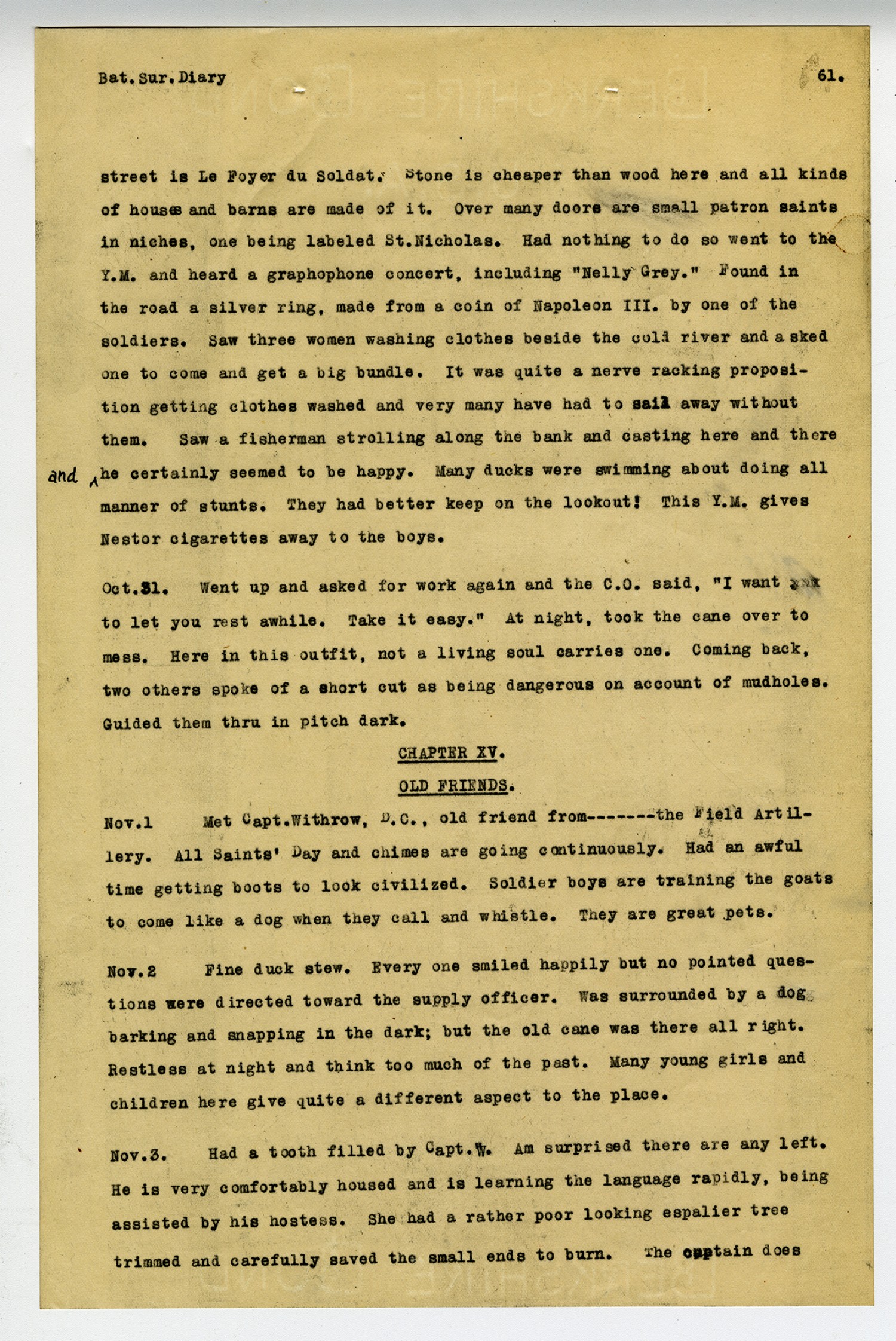 [page 61] Bat. Sur. Diary street is Le Foyer du Soldat. Stone is cheaper than wood here and all kinds of houses and barns are made of it. Over many doors are small patron saints in niches, one being labeled St. Nicholas. Had nothing to do so went to the Y.M. and heard a graphophone concert, including