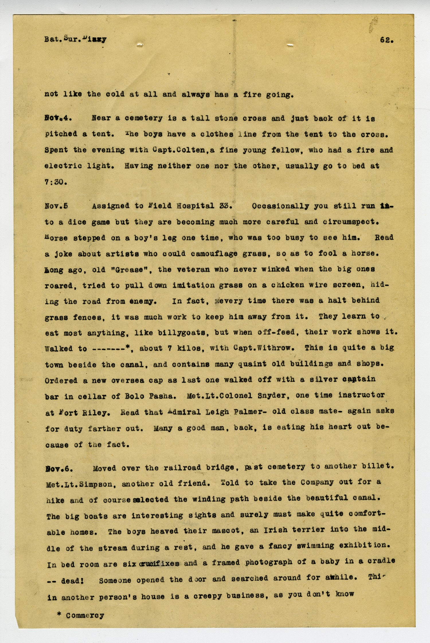 [page 62] Bat. Sur. Diary not like the cold at all and always has a fire going. [November] 4. Near a cemetery is a tall stone cross and just back of it is pitched a tent. The boys have a clothes line from the tent to the cross. Spent the evening with Capt. Colten, a fine young fellow, who had a fire and electric light. Having neither one nor the other, usually go to bed at 7:30. [November] 5 Assigned to Field Hospital 33. Occasionally you still run into a dice game but they are becoming much more careful and circumspect. Horse stepped on a boy