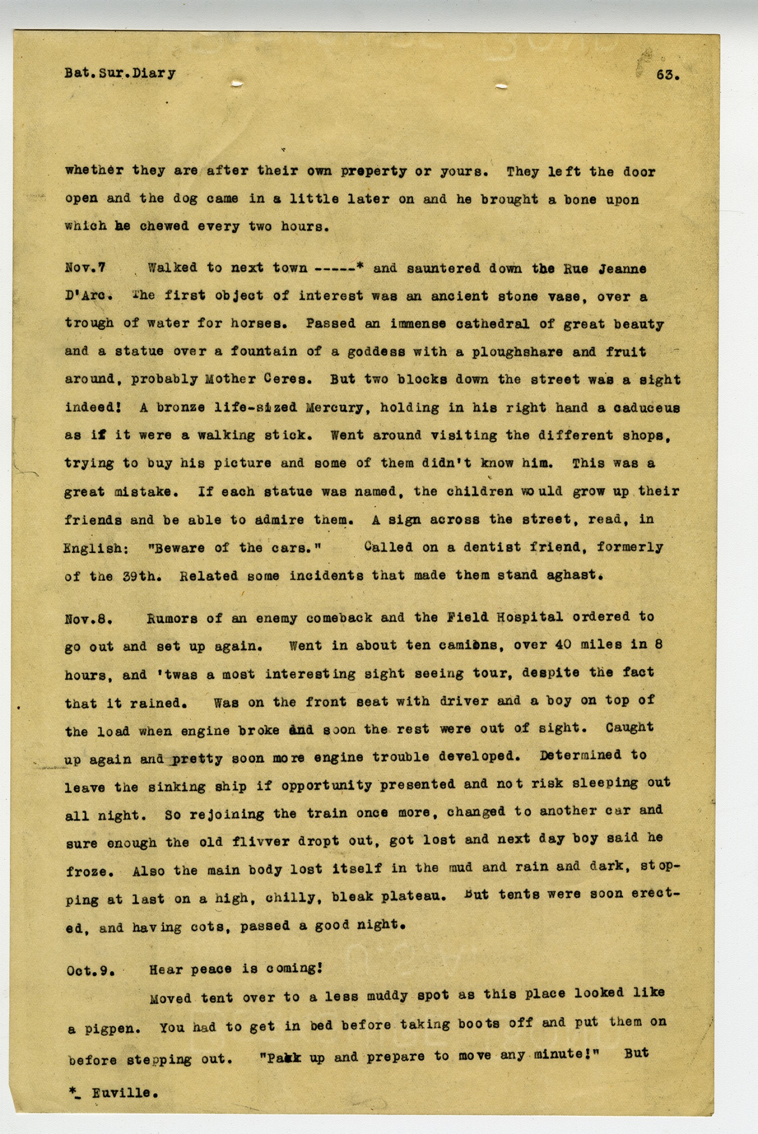 [page 63] Bat. Sur. Diary whether they are after their own property or yours. They left the door open and the dog came in a little later on and he brought a bone upon which he chewed every two hours. [November] 7 Walked to next town ----* and sauntered down the Rus Jeanne D