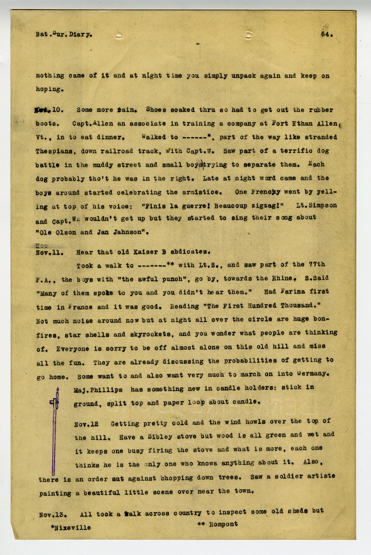 [page 64] Bat. Sur. Diary. nothing came of it and at night time you simply unpack again and keep on hoping. [November] 10 Some more rain. Shoes soaked thru so had to get out the rubber boots. Capt. Allen an associate in training a company at Fort Ethan Allen Vt., in to eat dinner. Walked to ----*, part of the way like stranded Thespians, down railroad track, with Capt. W. Saw part of a terrific dog battle in the muddy street and small boys trying to separate them. Each dog probably tho